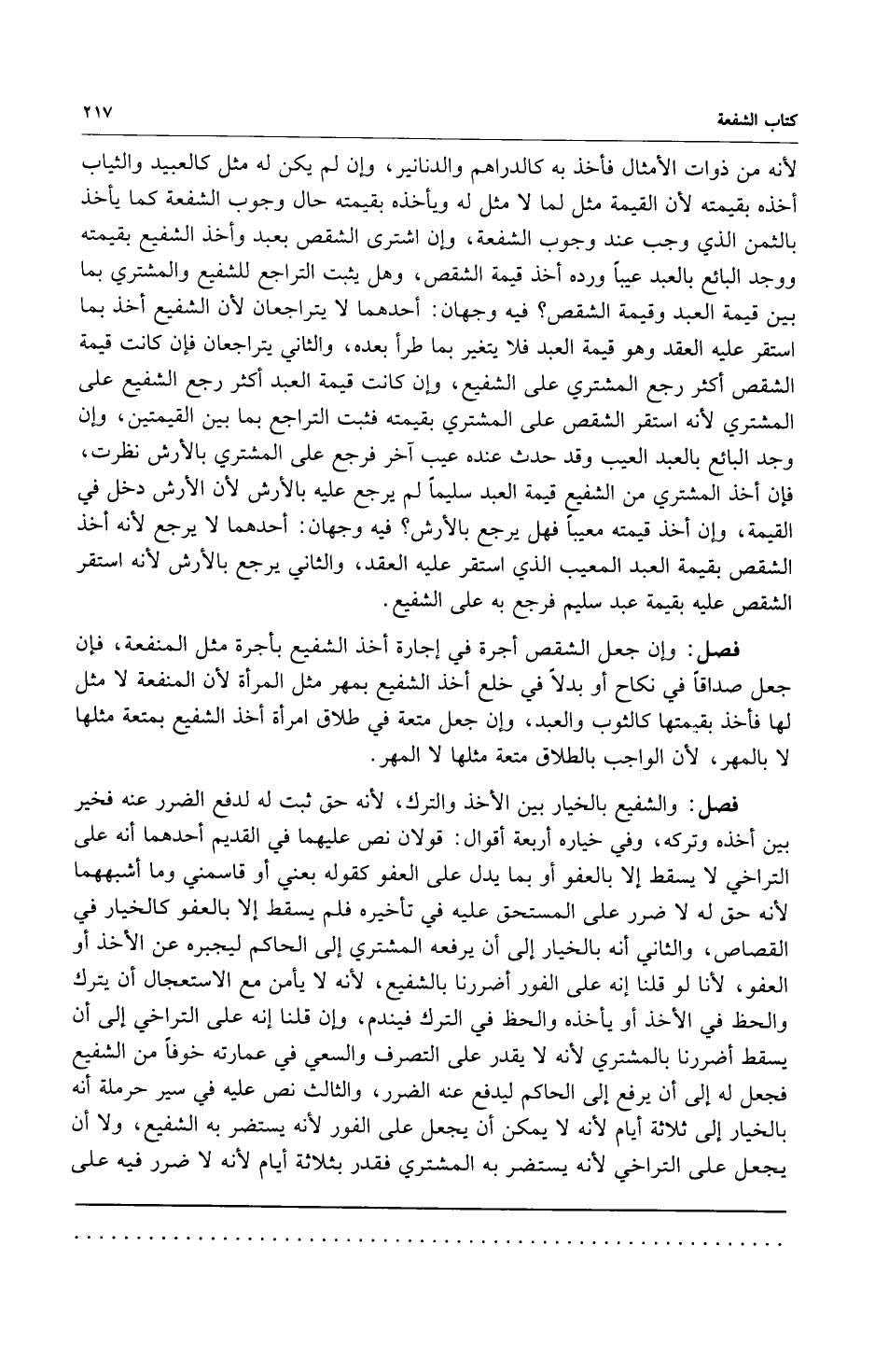 لأنه من ذوات الأمثال فأخذ به كالدراهم والدنانير وإن لم يكن له مثل كالعبيد والثياب أخذه بقيمته لأن القيمة مثل لما لا مثل له ويأخذه بقيمته حال وجوب الشفعة كما يأخذ بالثمن الذي وجب عنده وجوب الشفعة وإن اشترى الشقص بعبد أخذ الشفيع بقيمته ووجد البائع بالعبد عيباً ورده أخذ قيمة الشقص وهل يثبت التراجع للشفيع والمشتري بما بين قيمة العبد وقيمة الشقص؟ فيه وجهان: أحدهما لا يتراجعان لأن الشفيع أخذ بما استقر عليه العقد وهو قيمة العبد فلا يتغير بما طرأ بعده والثاني يتراجعان فإن كانت قيمة الشقص أكثر رجع المشتري على الشفيع وإن كانت قيمة العبد أكثر رجع الشفيع على المشتري لأنه استقر الشقص على المشتري بقيمته فثبت التراجع بما بين القيمتين وإن وجد البائع بالعبد العيب وقد حدث عنده عيب آخر فرجع على المشتري بالأرش نظرت فإن أخذ المشتري من الشفيع قيمة العبد سليماً لم يرجع عليه بالأرش لأن الأرش دخل في القيمة وإن أخذ قيمته معيباً فهل يرجع بالأرش؟ فيه وجهان: أحدهما لا يرجع لأنه أخذ الشقص بقيمة العبد المعيب الذي استقر عليه العقد والثاني يرجع بالأرش لأنه استقر الشقص عليه بقيمة عبد سليم فرجع به على الشفيع.