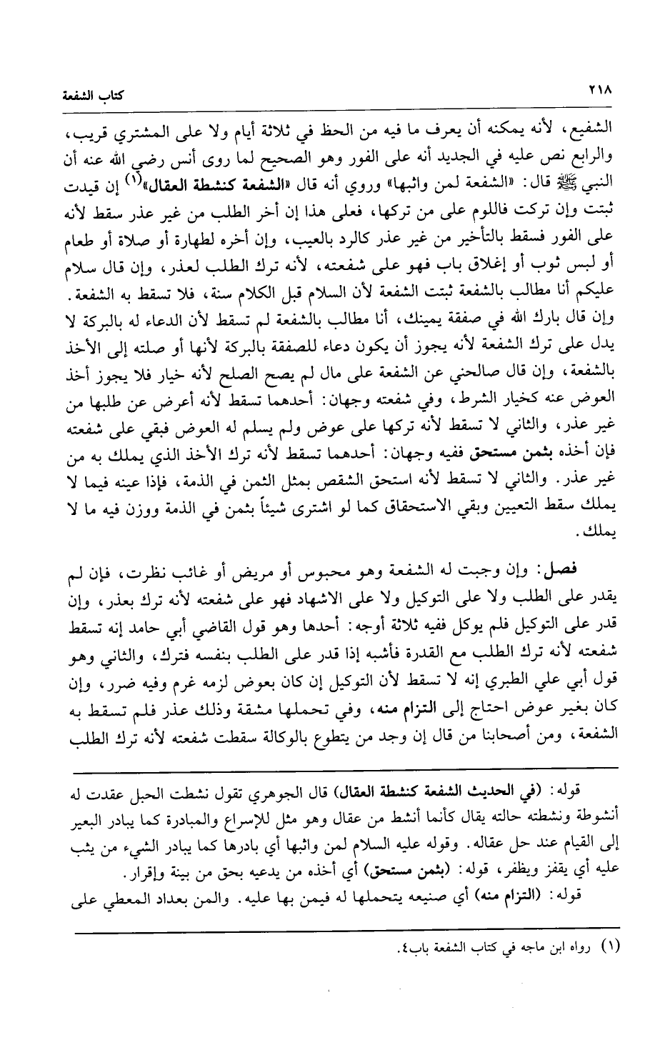 الشفيع، لأنه يمكنه أن يعرف ما فيه من الحظ في ثلاثة أيام ولا على المشتري قريب والرابع نص عليه في الجديد أنه على الفور وهو الصحيح لما روى أنس رضي الله عنه أن النبي صلى الله عليه وسلم قال: "الشفعة لمن واثبها" وروي أنه قال: "الشفعة كنشطة العقال" إن قيدت ثبتت وإن تركت فاللوم على من تركها فعلى هذا إن أخر الطلب من غير عذر سقط لأنه على الفور فسقط بالتأخير من غير عذر كالرد بالعيب وإن أخره لطهارة أو صلاة أو طعام أو لبس ثوب أو إغلاق باب فهو على شفعته لأنه ترك الطلب لعذر وإن قال سلام عليكم أنا مطالب بالشفعة ثبتت الشفعة لأن السلام قبل الكلام سنة فلا تسقط به الشفعة وإن قال بارك الله في صفقة يمينك أنا مطالب بالشفعة لم تسقط لأن الدعاء له بالبركة لا يدل على ترك الشفعة لأنه يجوز أن يكون دعاء للصفقة بالبركة لأنها أوصلته إلى الأخذ بالشفعة وإن قال صالحني عن الشفعة على مال لم يصح الصلح لأنه خيار فلا يجوز أخذ العرض عنه كخيار الشرط وفي شفعته وجهان: أحدهما تسقط لأنه أعرض عن طلبها من غير عذر والثاني لا يسقط لأنه تركها على عوض ولم يسلم له العوض فبقي على شفعته فإن أخذه بثمن مستحق ففيه وجهان: أحدهما تسقط لأنه ترك الأخذ الذي يملك به من غير عذر والثاني لا تسقط لأنه استحق الشقص بمثل الثمن في الذمة فإذا عينه فيما لا يملك سقط التعيين وبقي الاستحقاق كما لو اشترى شيئاً بثمن في الذمة ووزن فيه ما لا يملك.