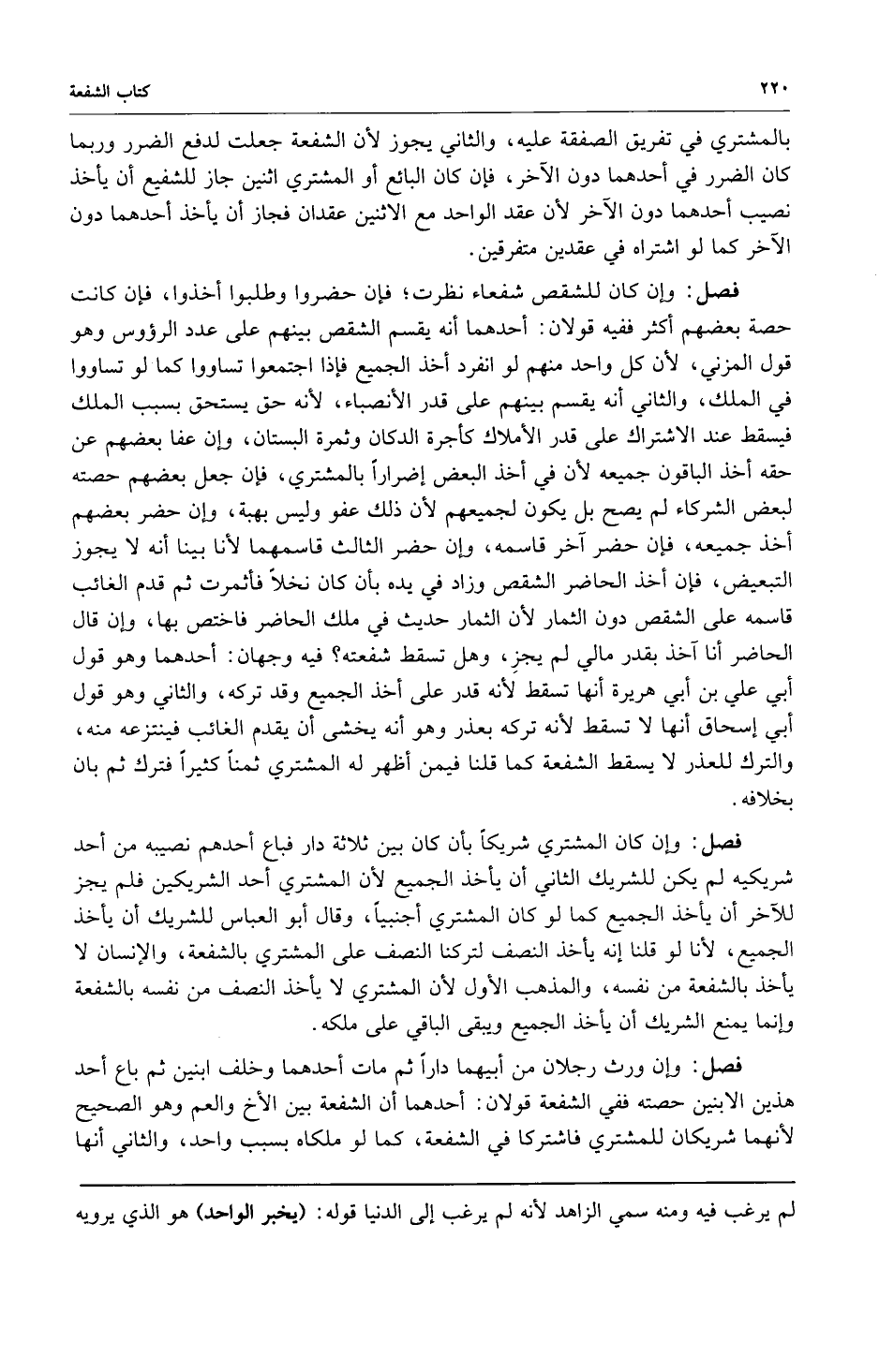 فصل: وإن كان للشقص شفعاء نظرت فإن حضروا وطلبوا أخذوا فإن كانت حصة بعضهم أكثر ففيه قولان: أحدهما أنه يقسم الشقص بينهم على عدد الرؤوس وهو قول المزني لأن كل واحد منهم لو انفرد أخذ الجميع فإذا اجتمعوا تساووا كما لو تساووا في الملك والثاني أنه يقسم بينهم على قدر الأنصباء لأنه حق يستحق بسبب الملك فيسقط عند الاشتراك على قدر الأملاك كأجرة الدكان وثمرة البستان وإن عفا بعضهم عن حقه أخذ الباقون جميعه لأن في أخذ البعض إضراراً بالمشتري فإن جعل بعضهم حصته لبعض الشركاء لم يصح بل يكون لجميعهم لأن ذلك عفو ليس بهبة وإن حضر بعضهم أخذ جميعه فإن حضر آخر قاسمه وإن حضر الثالث قاسمهما لأنا بينا أنه لا يجوز التبعيض فإن أخذ الحاضر الشقص وزاده في يده بأن كان نخلاً فأثمرت ثم قدم الغائب قاسمه على الشقص دون الثمار لأن الثمار حديث في ملك الحاضر فاختص بها وإن قال الحاضر أنا آخذ بقدر مالي لم يجز وهل تسقط شفعته؟ فيه وجهان: أحدهما وهو قول أبي علي بن أبي هريرة أنها تسقط لأنه قدر على أخذ الجميع وقد تركه والثاني وهو قول أبي إسحاق أنها لا تسقط لأنه تركه بعذر وهو أنه يخشى أن يقدم الغائب فينتزعه منه والترك للعذر لا يسقط الشفعة كما قلنا فيمن أظهر له المشتري ثمناً كثيراً ثم ترك ثم بان بخلافه.