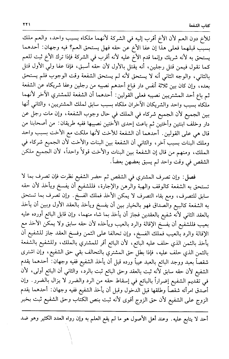 للأخ دون العم لأن الأخ أقرب إليه في الشركة لأنهما ملكاه بسبب واحد والعم ملك بسبب قبلهما فعلى هذا إن عفا الأخ عن حقه فهل يستحق العم؟ فيه وجهان: أحدهما يستحق به لأنه شريك وإنما قدم الأخ عليه لأنه أقرب في الشركة فإذا ترك الأخ ثبت للعم كما نقول فيمن قتل رجلين أنه يقتل الأول لأن حقه أسبق فإذا عفا ولي الأول قتل بالثاني والوجه الثاني أنه لا يستحق لأنه لم يستحق الشفعة وقت الوجوب فلم يستحق بعده وإن كان بين ثلاثة أنفس دار فباع أحدهم نصيبه من رجلين وعفا شريكاه عن الشفعة ثم باع أحد المشتريين نصيبه فعلى القولين: أحدهما أن الشفعة للمشتري الآخر لأنهما ملكاه بسبب واحد والشريكان الآخران ملكاه بسبب سابق لملك المشتريين والثاني أنها بين الجميع لأن الجميع شركاء في الملك في حال وجوب الشفعة وإن مات رجل عن دار وخلف ابنتين وأختين ثم باعت إحدى الأختين نصيبها ففيه طريقان: من أصحابنا من قال هي على القولين: أحدهما أن الشفعة للأخت لأنها ملكت مع الأخت بسبب واحد وملك البنات بسبب آخر والثاني أن الشفعة بين البنات والأخت لأن الجميع شركاء في الملك ومنهم من قال إن الشفعة بين البنات والأخت قولاً واحداً لأن الجميع ملكن الشقص في وقت واحد لم يسبق بعضهن بعضاً.