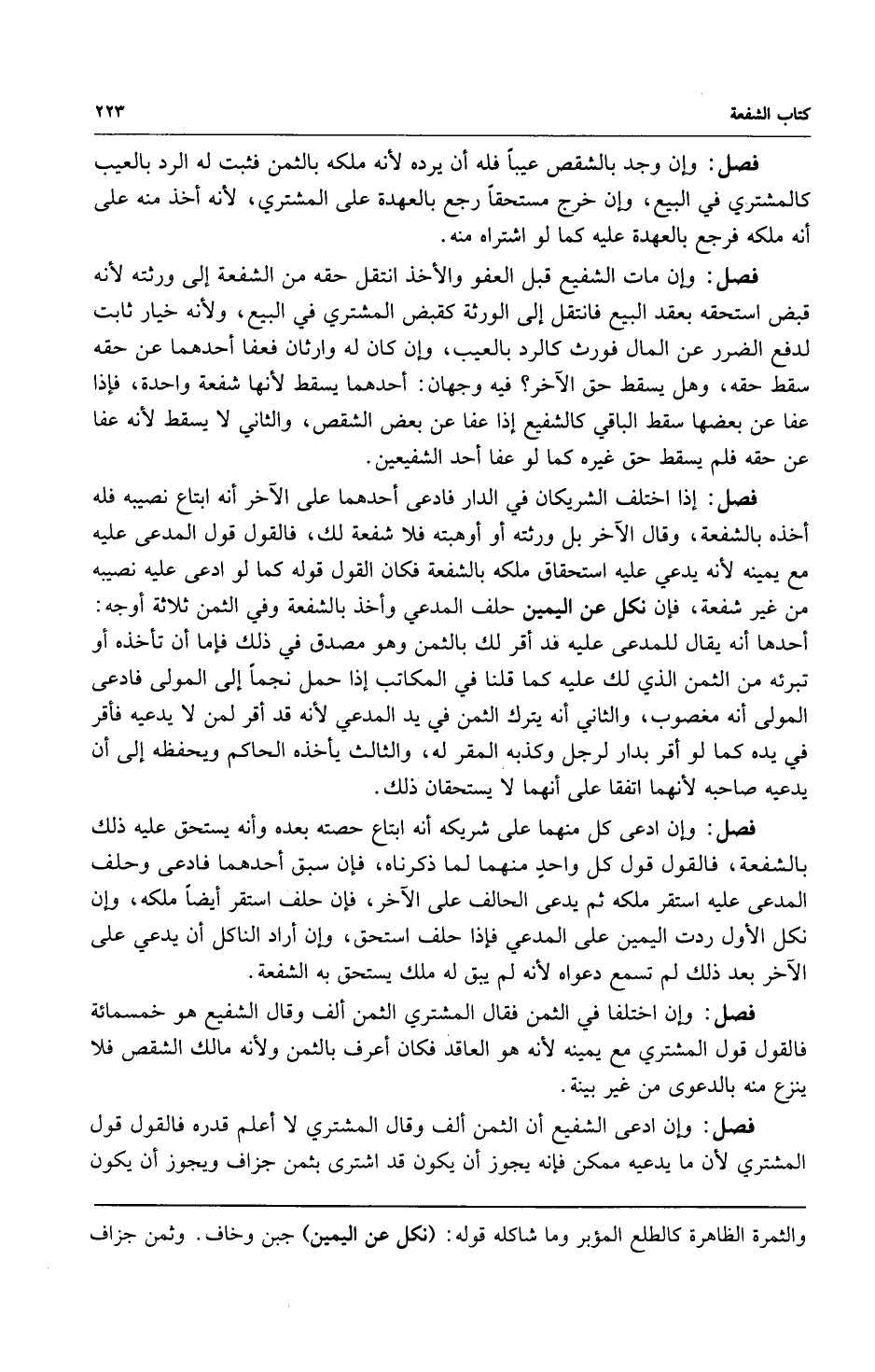 فصل: وإن وجد بالشقص عيباً فله أن يرده لأنه ملكه بالثمن فثبت له الرد بالعيب كالمشتري في البيع وإن خرج مستحقاً رجع بالعهدة على المشتري لأنه أخذ منه على أنه ملكه فرجع بالعهدة عليه كما لو اشتراه منه.