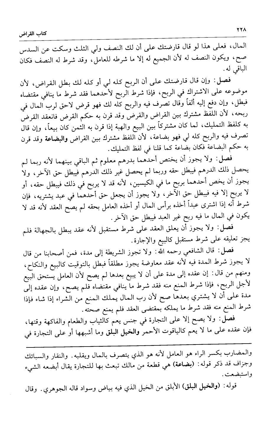 فصل: ولا يجوز أن يختص أحدهما بدرهم معلوم ثم الباقي بينهما لأنه ربما لم يحصل ذلك الدرهم فيبطل حقه وربما لم يحصل غير ذلك الدرهم فيبطل حق الآخر ولا يجوز أن يخص أحدهما بربح ما في الكيسين لأنه قد لا يربح في ذلك فيبطل حقه أو لا يربح إلا فيه فيبطل حق الآخر ولا يجوز أن يجعل حق أحدهما في عبد يشتريه فإن شرط أنه إذا اشترى عبداً أخذه برأس المال أو أخذه العامل بحقه لم يصح العقد لأنه قد لا يكون في المال ما فيه ربح غير العبد فيبطل حق الآخر.