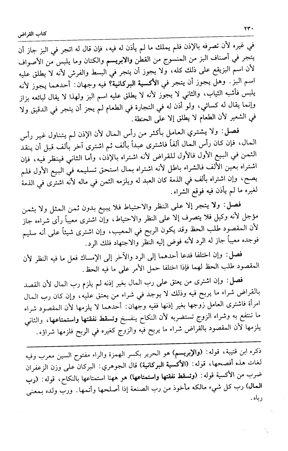 فصل: وإن اشترى من يعتق على رب المال بغير إذنه لم يلزم رب المال لأن القصد بالقراض شراء ما يربح فيه وذلك لا يوجد في شراء من يعتق عليه وإن كان رب المال امرأة فاشترى العامل زوجها بغير إذنها ففيه وجهان: أحدهما لا يلزمها لأن المقصود شراء ما تنتفع به وشراء الزوج تستضر به لأن النكاح ينفسخ وتسقط نفقتها واستمتاعها والثاني يلزمها لأن المقصود بالقراض شراء ما يربح فيه والزوج كغيره في الربح فلزمها شراؤه.