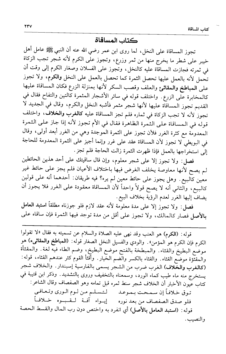 تجوز المساقاة على النخل لما روى ابن عمر رضي الله عنه أن النبي صلى الله عليه وسلم عامل أهل خيبر على شطر ما يخرج منها من ثمر وزرع وتجوز على الكرم لأنه شجر تجب الزكاة في ثمرته فجازت المساقاة عليه كالنخيل وتجوز على الفسلان وصغار الكرم إلى وقت أن تحمل لأنه بالعمل عليها تحصل الثمرة كما تحصل بالعمل على النخل والكرم ولا تجوز على المباطخ والمقاثئ والعلف وقصب السكر لأنها بمنزلة الزرع فكان المساقاة عليها كالمخابرة على الزرع واختلف قوله في سائر الأشجار المثمرة كالتين والتفاح فقال في القديم تجوز المساقاة عليها لأنه شجر مثمر فأشبه النخل والكرم وقال في الجديد لا تجوز لأنه لا تجب الزكاة في ثماره فلم تجز المساقاة عليه كالغرب والخلاف واختلف قوله في المساقة على الثمرة الظاهرة فقال في الأم تجوز لأنه إذا جاز على الثمرة المعدومة مع كثرة الغرر فلأن تجوز على الثمرة الموجدة وهي من الغرر أبعد أولى وقال في البويطي لا تجوز لأن المساقاة عقد على غرر وإنما أجيز على الثمرة المعدومة للحاجة إلى استخراجها بالعمل فإذا ظهرت الثمرة زالت الحاجة فلم تجز.