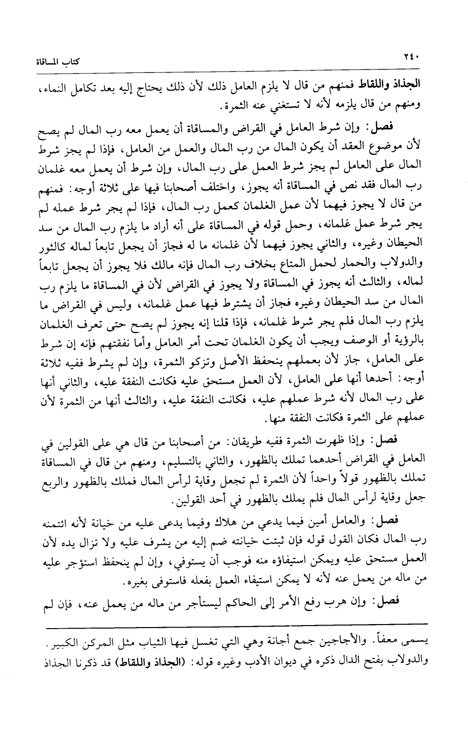 فصل: وإن شرط العامل في القراض والمساقاة أن يعمل معه رب المال لم يصح لأن موضوع العقد أن يكون المال من رب المال والعمل من العامل فإذا لم يجز شرط المال على العامل لم يجز شرط العمل على رب المال وإن شرط أن يعمل معه غلمان رب المال فقد نص في المساقاة أنه يجوز واختلف أصحابنا فيها على ثلاثة أوجه فمنهم من قال لا يجوز فيهما لأن عمل الغلمان كعمل رب المال فإذا لم يجز شرط عمله لم يجز شرط عمل غلمانه وحمل قوله في المساقاة على أنه أراد ما يلزم رب المال من سد الحيطان وغيره والثاني يجوز فيهما لأن غلمانه ماله فجاز أن يجعل تابعاً لماله كالثور والدولاب والحمار لحمل المتاع بخلاف رب المال فإنه مالك فلا يجوز أن يجعل تابعاً لماله والثالث أنه يجوز في المساقاة ولا يجوز في القراض لأن في المساقاة ما يلزم رب المال من سد الحيطان وغيره فجاز أن يشترط فيها عمل غلمانه وليس في القراض ما يلزم رب المال فلم يجر شرط غلمانه فإذا قلنا إنه يجوز لم يصح حتى تعرف الغلمان بالؤية أو الوصف ويجب أن يكون الغلمان تحت أمر العامل وأما نفقتهم فإنه إن شرط على العامل جاز لأن بعملهم ينحفظ الأصل وتزكو الثمرة وإن لم يشرط ففيه ثلاثة أوجه: أحدها أنها على العامل لأن العمل مستحق عليه فكانت النفقة عليه والثاني أنها على رب المال لأنه شرط عملهم عليه فكانت النفقة عليه والثالث أنها من الثمرة لأن عملهم على الثمرة فكانت النفقة منها.