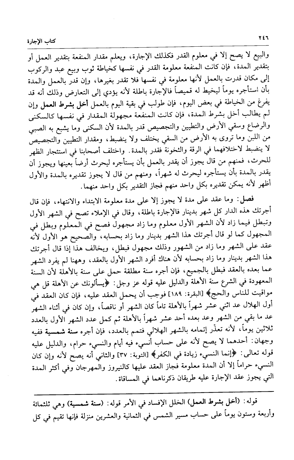 والبيع لا يصح إلا في معلوم القدر فكذلك الإجارة ويعلم مقدار المنفعة بتقدير العمل أو بتقدير المدة فإن كانت المنفعة معلومة القدر في نفسها كخياطة ثوب وبيع عبد والركوب إلى مكان قدرت بالعمل لأنها معلومة في نفسها فلا تقدر بغيرها وإن قدر بالعمل والمدة بأن استأجره يوماً ليخيط له قميصاً فالإجارة باطلة لأنه يؤدي إلى التعارض وذلك أنه قد يفرغ من الخياطة في بعض اليوم فإن طولب في بقية اليوم بالعمل أخل بشرط العمل وإن لم يطالب أخل بشرط المدة فإن كانت المنفعة مجهولة المقدار في نفسها كالسكنى والرضاع وسقي الأرض والتطيين والتجصيص قدر بالمدة لأن السكنى وما يشبع به الصبي من اللبن وما تروى به الرض من السقي يختلف ولا ينضبط ومقدار التطيين والتجصيص لا ينضبط لاختلافهما في الرقة والثخونة فقدر بالمدة واختلف أصحابنا في استئجار الظهر للحرث فمنهم من قال يجوز أن يقدر بالعمل بأن يستأجره ليحرث أرضاً بعينها ويجوز أن يقدر بالمدة بأن يستأجره ليحرث له شهراً ومنهم من قال لا يجوز تقديره بالمدة والأول أظهر لأنه يمكن تقديره بكل واحد منهم فجاز التقدير بكل واحد منهما.