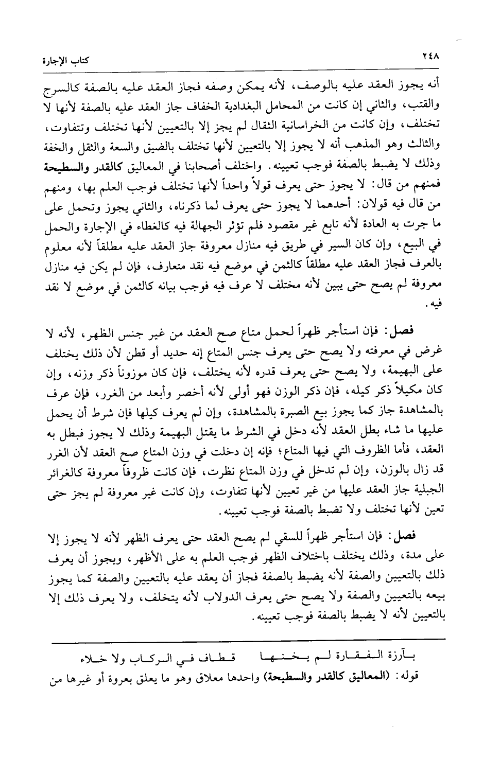 أنه يجوز العقد عليه بالوصف لأنه يمكن وصفه فجاز العقد عليه بالصفة كالسرج والقتب والثاني إن كانت من المحامل البغدادية الخفاف جاز العقد عليه بالصفة لأنها لا تختلف وإن كانت من الخراسانية الثقال لم يجز إلا بالتعيين لأنها تختلف وتتفاوت والثالث وهو المذهب أنه لا يجوز إلا بالتعيين لأنها تختلف بالضيق والسعة والثقل والخفة وذلك لا يضبط بالصفة فوجب تعيينه واختلف أصحابنا في المعاليق كالقدر والسطيحة فمنهم من قال: لا يجوز حتى يعرف قولاً واحداً لأنها تختلف فوجب العلم بها ومنهم من قال فيه قولان: أحدهما لا يجوز حتى يعرف لما ذكرناه والثاني يجوز وتحمل على ما جرت به العادة لأنه تابع غير مقصود فلم تؤثر الجهالة فيه كالغطاء في الإجارة والحمل في البيع وإن كان السير في طريق فيه منازل معروفة جاز العقد عليه مطلقاً لأنه معلوم بالعرف فجاز العقد عليه مطلقاً كالثمن في موضع فيه نقد متعارف فإن لم يكن فيه منازل معروفة لم يصح حتى يبين لأنه مختلف لا عرف فيه فوجب بيانه كالثمن في موضع لا نقد فيه.