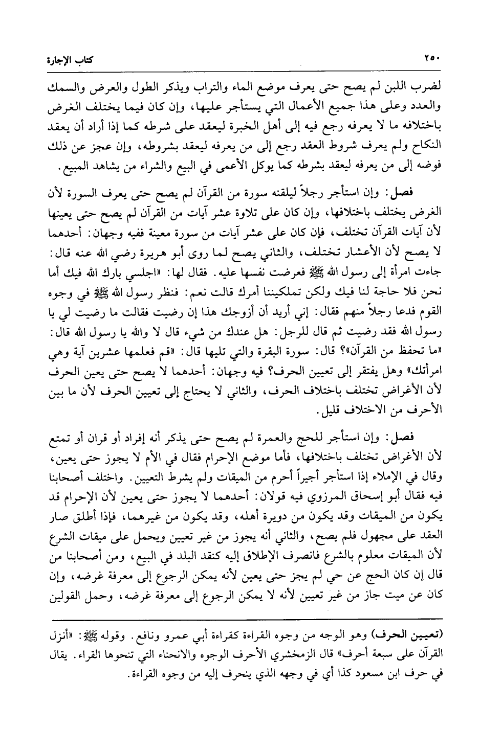 فصل: وإن استأجر رجلاً ليلقنه سورة من القرآن لم يصح حتى يعرف السورة لأن الغرض يختلف باختلافها وإن كان على تلاوة عشر آيات من القرآن لم يصح حتى يعينها لأن آيات القرآن تختلف فإن كان على عشر آيات من سورة معينة ففيه وجهان: أحدهما لا يصح لأن الأعشار تختلف والثاني يصح لما روى أبو هريرة رضي الله عنه قال: جاءت امرأة إلى رسول الله صلى الله عليه وسلم فعرضت نفسها عليه فقال لها: "اجلسي بارك الله فيك أما نحن فلا حاجة لنا فيك ولكن تملكيننا أمرك" قالت نعم: فنظر رسول الله صلى الله عليه وسلم في وجوه القوم فدعا رجلاً منهم فقال: "إني أريد أن أزوجك هذا إن رضيت" فقالت ما رضيت لي يا رسول الله صلى الله عليه وسلم فقد رضيت ثم قال للرجل: "هل عندك من شيء" قال لا والله يا رسول الله قال: "ما تحفظ من القرآن؟ " قال: سورة البقرة والتي تليها قال: "قم فعلمها عشرين آية وهي امرأتك" وهل يفتقر إلى تعيين الحرف؟ فيه وجهان: أحدهما لا يصح حتى يعين الحرف لأن الأغراض تختلف باختلاف الحرف والثاني لا يحتاج إلى تعيين الأحرف لأن ما بين الأحرف من الاختلاف قليل.