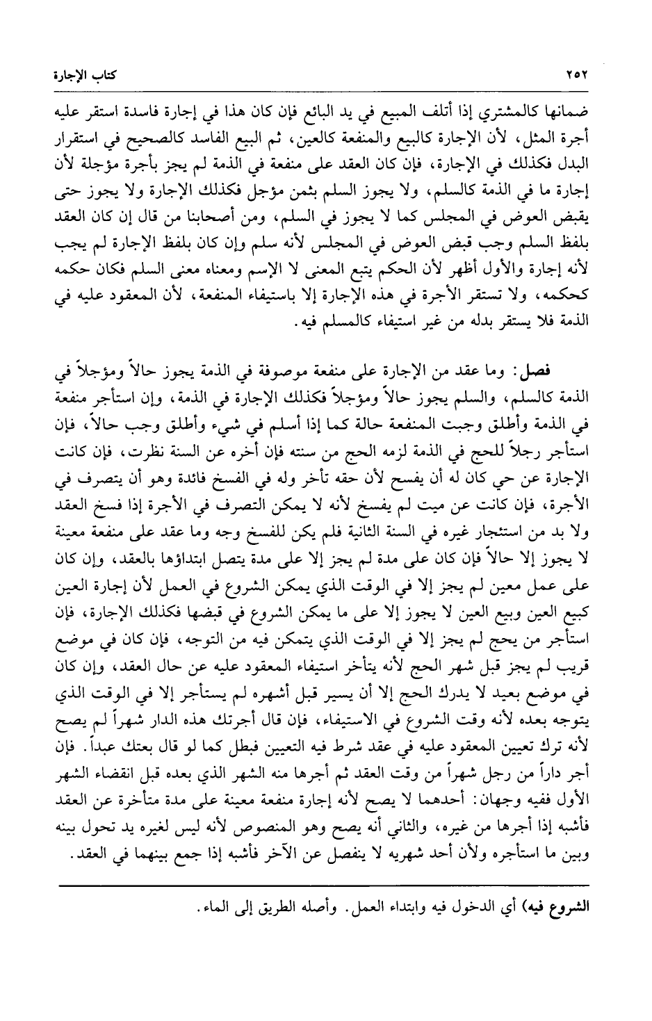 فصل: وما عقد من الإجارة على منفعة موصوفة في الذمة يجوز حالاً ومؤجلاً في الذمة كالسلم والسلم يجوز حالاً ومؤجلاً فكذلك الإجارة في الذمة وإن استأجر منفعة في الذمة وأطلق وجبت المنفعة حالة كما إذا أسلم في شيء وأطلق وجب حالاً فإن استأجر رجلاً للحج في الذمة لزمه الحج من سنته فإن أخره عن السنة نظرت فإن كانت الإجارة عن حي كان له أن يفسخ لأن حقه تأخر وله في الفسخ فائدة وهو أن يتصرف في الأجرة فإن كانت عن ميت لم يفسخ لأنه لا يمكن التصرف في الأجرة إذا فسخ العقد ولا بد من استئجار غيره في السنة الثانية فلم يكن للفسخ وجه وما عقد على منفعة معينة لا يجوز إلا حالاً فإن كان على مدة لم يجز إلا على مدة يتصل ابتداؤها بالعقد وإن كان على عمل معين لم يجز إلا في الوقت الذي يمكن الشروع في العمل لأن إجارة العين كبيع العين وبيع العين لا يجوز إلا على ما يمكن الشروع في قبضها فكذلك الإجارة فإن استأجر من يحج له لم يجز إلا في الوقت الذي يتمكن فيه من التوجه فإن كان في موضع قريب لم يجز قبل شهر الحج لأنه يتأخر استيفاء المعقود عليه عن حال العقد وإن كان في موضع بعيد لا يدرك الحج إلا أن يسير قبل أشهره لم يستأجر إلا في الوقت الذي يتوجه بعده لأنه وقت الشروع في الاستيفاء فإن قال أجرتك هذه الدار شهراً لم يصح لأنه ترك تعيين المعقود عليه في عقد شرط فيه التعيين فبطل كما لو قال بعتك عبداً فإن أجر داراً من رجل شهراً من وقت العقد ثم أجرها منه الشهر الذي بعده قبل انقضاء الشهر الأول ففيه وجهان: أحدهما لا يصح لأنه إجارة منفعة معينة على مدة متأخرة عن العقد فأشبه إذا أجرها من غيره والثاني أنه يصح وهو المنصوص لأنه ليس لغيره يد تحول بينه وبين ما استأجر ولأن أحد شهريه لا ينفصل عن الآخر فأشبه إذا جمع بينهما في العقد