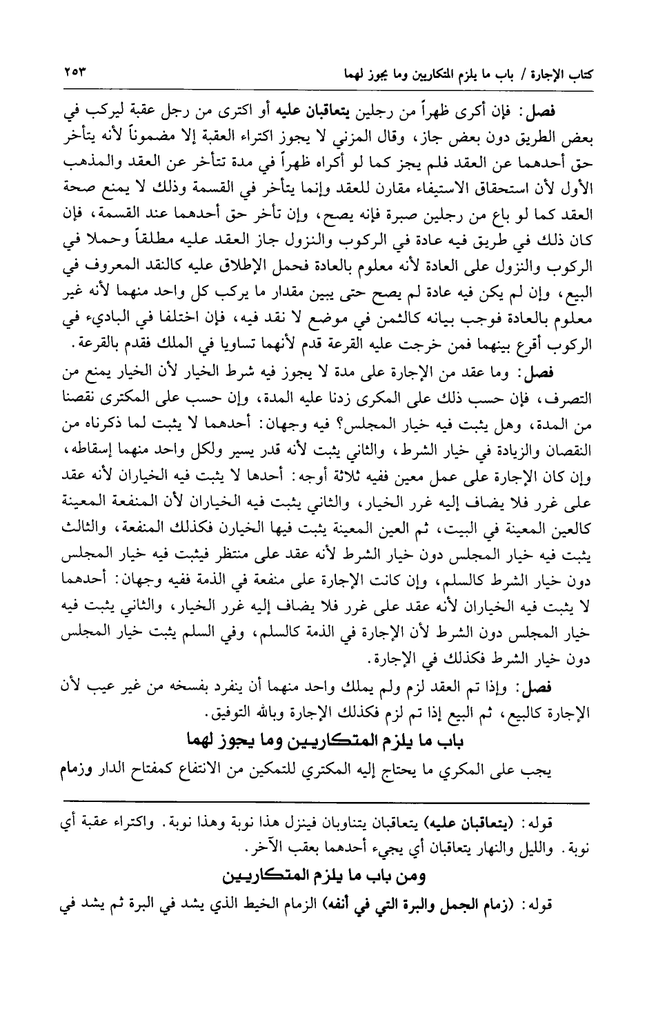 فصل: فإن أكرى ظهراً من رجلين يتعاقبان عليه أو اكترى من رجل عقبة ليركب في بعض الطريق دون بعض جاز وقال المزني لا يجوز اكتراء العقبة إلا مضموناً لأنه يتأخر حق أحدهما عن العقد فلم يجز كما لو أكراه ظهراً في مدة تتأخر عن العقد والمذهب الأول لأنه استحقاق الاستيفاء مقارن للعقد وإنما يتأخر في القسمة وذلك لا يمنع صحة العقد كما لو باع من رجلين صبرة فإنه يصح وإن تأخر حق أحدهما عند القسمة فإن كان ذلك في طريق فيه عادة في الركوب والنزول جاز العقد عليه مطلقاً وحملا في الركوب والنزول على العادة لأنه معلوم بالعادة فحمل الإطلاق عليه كالنقد المعروف في البيع وإن لم يكن فيه عادة لم يصح حتى يبين مقدار ما يركب كل واحد منهما لأنه غير معلوم بالعادة فوجب بيانه كالثمن في موضع لا نقد فيه فإن اختلفا في البادئ في الركوب أقرع بينهما فمن خرجت عليه القرعة قدم لأنهما تساويا في الملك فقدم القرعة.