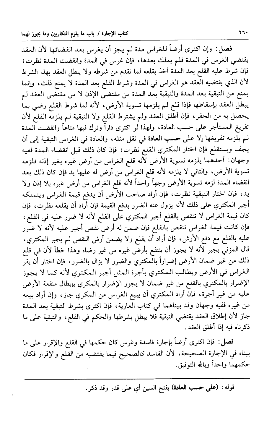 فصل: وإن اكترى أرضاً للغراس مدة لم يجز أن يغرس بعد انقضائها لأن العقد يقتضي الغرس في المدة فلم يملك بعدها فإن غرس في المدة وانقضت المدة نظرت فإن شرط عليه القلع بعد المدة أخذ بقلعه لما تقدم من شرطه ولا يبطل العقد بهذا الشرط لأن الذي يقتضيه العقد هو الغراس في المدة وشرط القلع بعد المدة لا يمنع ذلك وإنما يمنع من التبقية بعد المدة والتبقية بعد المدة من مقتضى الإذن لا من مقتضى العقد لم يبطل العقد بإسقاطها فإذا قلع لم يلزمها تسوية الأرض لأنه لما شرط القلع رضي بما يحصل به من الحفر فإن أطلق العقد ولم يشترط القلع ولا التبقية لم يلزمه القلع لأن تفريغ المستأجر على حسب العادة ولهذا لو اكترى داراً وترك فيها متاعاً وانقضت المدة لم يلزمه المستأجر على حسب العادة ولهذا لو اكترى داراً وترك فيها متاعاً وانقضت المدة لم يلزمه تفريغها إلا على حسب العادة في نقل مثله والعادة في الغراس التبقية إلى أن يجف ويستقلع فإن اختار المكتري القلع نظرت فإن كان ذلك قبل انقضاء المدة ففيه وجهان: أحدهما يلزمه تسوية الأرض لأنه قلع الغراس من أرض غيره بغير إذنه فلزمه تسوية الأرض والثاني لا يلزمه لأنه قلع الغراس من أرض غيره بغير إذنه فلزمه تسوية الأرض والثاني لا يلزمه لأنه قلع الغراس من أرض له عليه يد فإن كان ذلك بعد انقضاء المدة لزمه تسوية الأرض وجهاً واحداً لأنه قلع الغراس من أرض غيره بلا إذن ولا يد فإن اختار التبقية نظرت فإن أراد صاحب الأرض أن يدفع قيمة الغراس ويتملكه أجبر المكتري على ذلك لأنه يزول عنه الضرر بدفع القيمة فإن أراد أن يقلعه نظرت فإن كان قيمة الغراس لا تنقص بالقلع أجبر المكتري على القلع لأنه لا ضرر عليه في القلع فإن كانت قيمة الغراس تنقص بالقلع أجبر المكتري على القلع لأنه لا ضرر عليه في القلع فإن كانت قيمة الغراس تنقص بالقلع فإن ضمن له أرض نقص أجبر عليه لأنه لا ضرر عليه بالقلع مع دفع الأرش فإن أراد أن يقلع ولا يضمن أرش النقص لم يجبر المكتري قال المزني يجبر لأنه لا يجوز أن ينتفع بأرض غيره من غير رضاه وهذا خطأ لأن في قلع ذلك من غير ضمان الأرض إضراراً بالمكتري والضرر لا يزال بالضرر فإن اختار أن يقر الغراس في الأرض ويطالب المكتري بأجرة المثل أجبر المكتري لأنه كما لا يجوز الإضرار بالمكتري بالقلع من غير ضمان لا يجوز الإضرار بالمكري بإبطال منفعة الأرض عليه من غير أجرة فإن أراد المكتري أن يبيع الغراس من المكري جاز وإن أراد بيعه من غيره ففيه وجهان وقد بيناهما في كتاب العارية فإن اكترى بشرط التبقية بعد المدة جاز لأن إطلاق العقد يقتضي التبقية فلا يبطل بشرطها والحكم في القلع والتبقية على ما ذكرناه فيه إذا أطلق العقد.