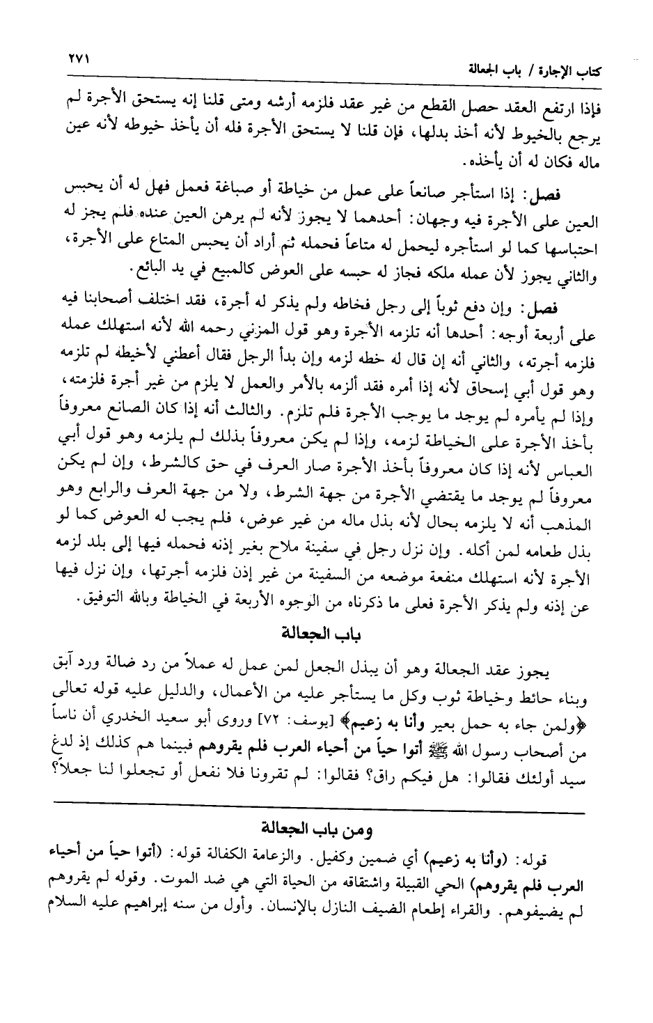 يجوز عقد الجعالة وهو أن يبذل الجعل لمن عمل له عملاً من رد ضالة ورد آبق وبناء حائط وخياطة ثوب وكل ما يستأجر عليه من الأعمال والدليل عليه قوله تعالى: {وَلِمَنْ جَاءَ بِهِ حِمْلُ بَعِيرٍ وَأَنَا بِهِ زَعِيمٌ} [يوسف: 72] وروى أبو سعيد الخدري أن ناساً من أصحاب رسول الله صلى الله عليه وسلم أتوا حياً من أحياء العرب فلم يقروهم فبينما هم كذلك إذ لدغ سيد أولئك فقالوا: هل فيكم راق؟ فقالوا: لم تقرونا فلا نفعل أو تجعلوا لنا جعلاً؟