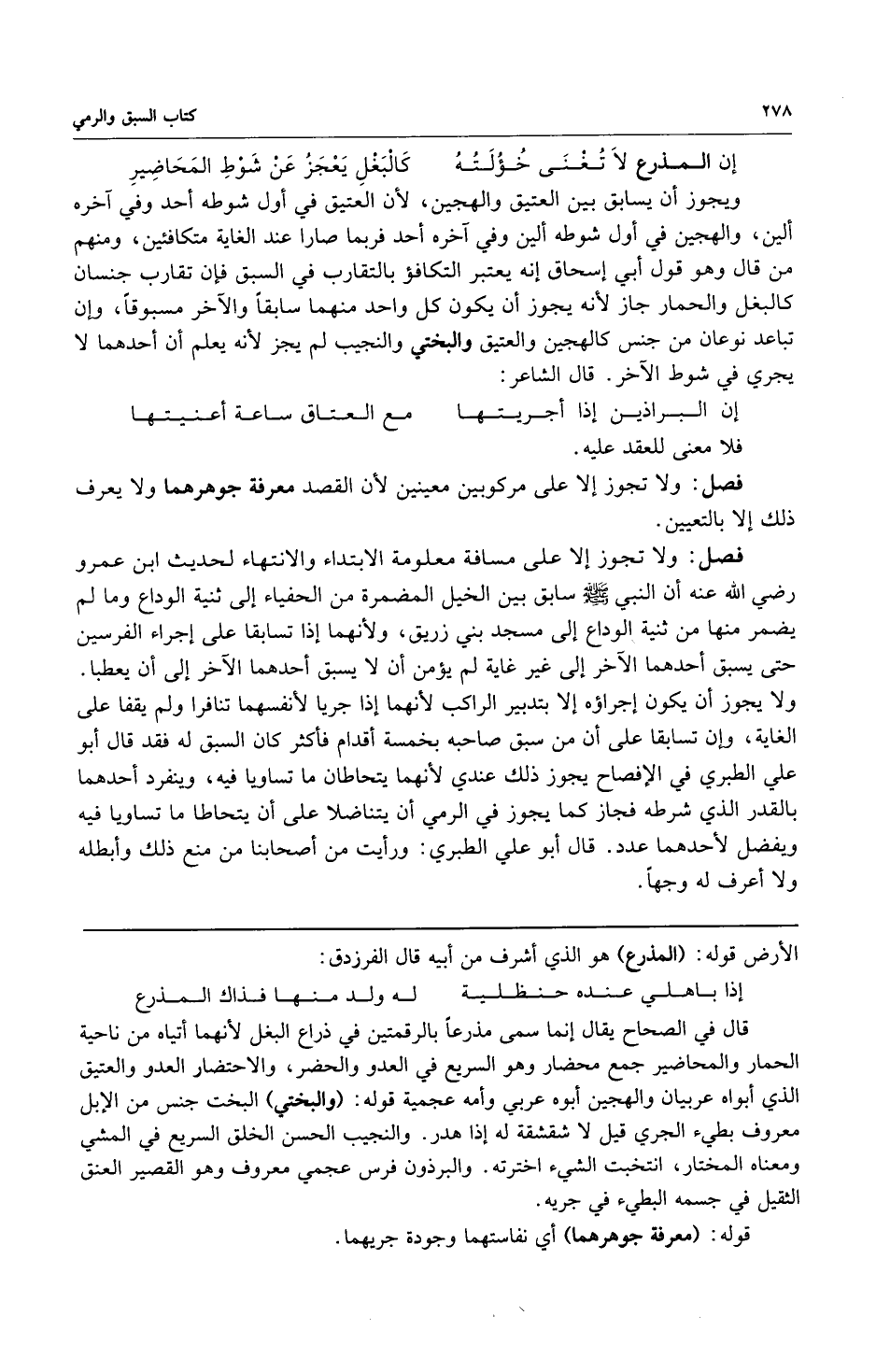 ويجوز أن يسابق بين العتيق والهجين لأن العتيق في أول شوطه أحد وفي آخره ألين والهجين في أول شوطه أليه وفي آخره أحد فربما صارا عند الغاية متكافئين ومنهم من قال وهو قول أبي إسحاق إنه يعتبر التكافؤ بالتقارب في السبق فإن تقارب جنسان كالبغل والحمار جاز لأنه يجوز أن يكون لكل واحد منهما سابقاً والآخر مسبوقاً وإن تباعد نوعان من جنس كالهجين والعتيق والبختي والنجيب لم يجز لأنه يعلم أن أحدهما لا يجري في شوط الآخر قال الشاعر: