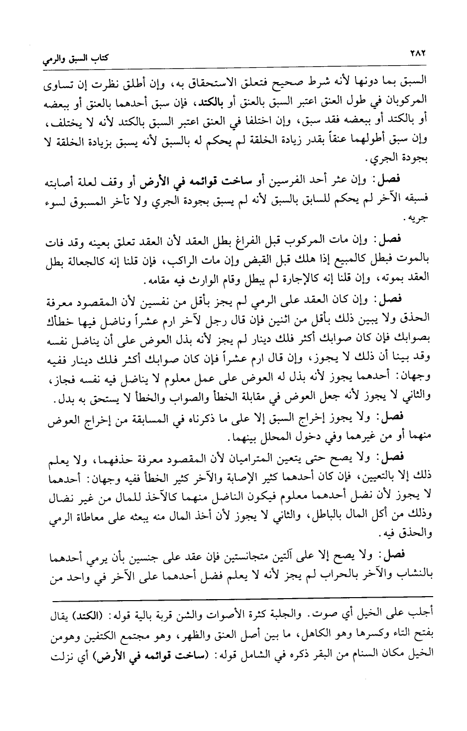 السبق بما دونها لأنه شرط صحيح فتعلق الاستحقاق به وإن أطلق نظرت إن تساوى المركوبان في طول العنق اعتبر السبق بالعنق أو بالكتد فإن سبق أحدهما بالعنق أو ببعضه أو بالكتد أو ببعضه فقد سبق وإن اختلفا في العنق اعتبر السبق بالكتد لأنه لا يختلف وإن سبق أطولهما عنقاً بقدر زيادة الخلقة لم يحكم له بالسبق لأنه يسبق بزيادة الخلقة لا بجودة الجري.
