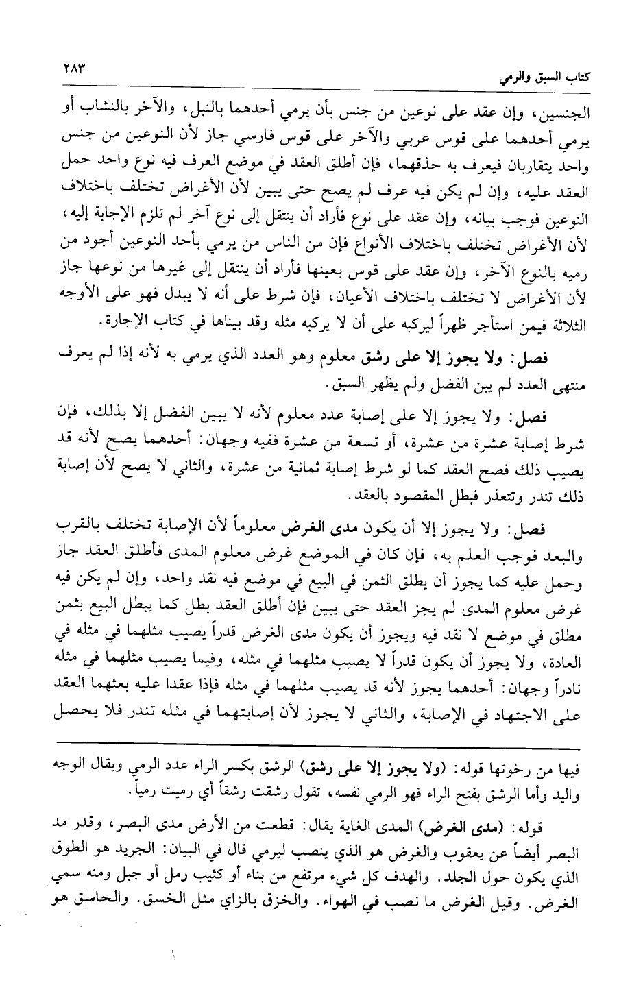 فصل: ولا يجوز إلا أن يكون مدى الغرض معلوماً لأن الإصابة تختلف بالقرب والبعد فوجب العلم به فإن كان في الموضع غرض معلوم المدى فأطلق العقد جاز وحمل عليه كما يجوز أن يطلق الثمن في البيع في موضع فيه نقد واحد وإن لم يكن فيه غرض معلوم المدى لم يجز العقد حتى يبين فإن أطلق العقد بطل كما يبطل البيع بثمن مطلق في موضع لا نقد فيه ويجوز أن يكون مدى الغرض قدراً يصيب مثلهما في مثله في العادة ولا يجوز أن يكون قدراً لا يصيب مثلهما في مثله وفيما يصيب مثلهما في مثله نادراً وجهان: أحدهما يجوز لأنه قد يصيب مثلهما في مثله فإذا عقدا عليه بعثهما العقد على الاجتهاد في الإصابة والثاني لا يجوز لأن إصابتهما في مثله تندر فلا يحصل