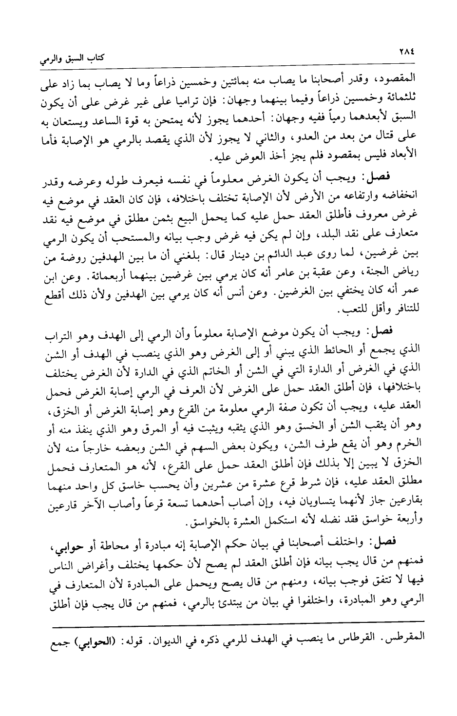 فصل: ويجب أن يكون موضع الإصابة معلوماً وأن الرمي إلى الهدف وهو التراب الذي يجمع أو الحائط الذي يبني أو إلى الغرض وهو الذي ينصب في الهدف أو الشن الذي في الغرض أو الدارة التي في الشن أو الخاتم الذي في الدارة لأن الغرض يختلف باختلافها فإن أطلق العقد حمل على الغرض لأن العرف في الرمي إصابة الغرض فحمل العقد عليه ويجب أن تكون صفة الرمي معلومة من القرع وهو إصابة الغرض أو الخزق وهو أن يثقب الشن أو الخسق وهو الذي يثقبه ويثبت فيه أو المرق وهو الذي ينفذ منه أو الخرم وهو أن يقع طرف الشن ويكون بعض السهم في الشن وبعضه خارجاً منه لأن الخزق لا يبين إلا بذلك فإن أطلق العقد حمل على القرع لأنه هو المتعارف فحمل مطلق العقد عليه فإن شرط قرع عشرة من عشرين وأن يحسب خاسق كل واحد منهما بقارعين جاز لأنهما يتساويان فيه وإن أصاب أحدهما تسعة قرعاً وأصاب الآخر قارعين وأربعة خواسق فقد نضله لأنه استكمل العشرة بالخواسق.