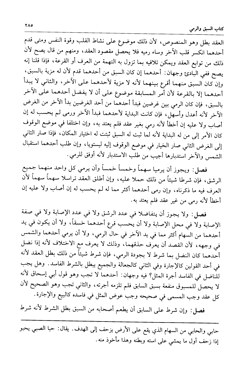 فصل: ولا يجوز أن يتفاضلا في عدد الرشق ولا في عدد الإصابة ولا في صفة الإصابة ولا في محل الإصابة ولا أن يحسب قرع أحدهما خسقاً ولا أن يكون في يد أحدهما السهام أكثر مما في يد الآخر في حال الرمي ولا أن يرمي أحدهما والشمس في وجهه لأن القصد أن يعرف حذقهما وذلك لا يعرف مع الاختلاف لأنه إذا نضل أحدهما كان النضل بما شرط لا بجودة الرمي فإن شرط شيئاً من ذلك بطل العقد لأنه في أحد القولين كالإجارة وفي الثاني كالجعالة والجميع يبطل بالشرط الفاسد وهل يجب للناضل في الفاسد أجرة المثل؟ فيه وجهان: أحدهما لا تجب وهو قول أبي إسحاق لأنه لا يحصل للمسبوق منفعة بسبق السابق فلم تلزمه أجرته والثاني تجب وهو الصحيح لأن كل عقد وجب المسمى في صحيحه وجب عوض المثل في فاسده كالبيع والإجارة.