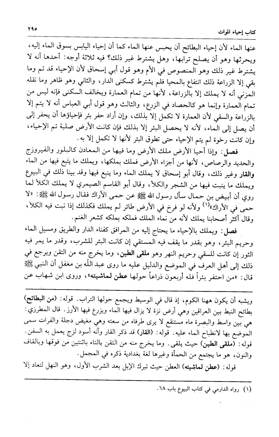 عنها الماء لأن إحياء البطائح أن يحبس عناه الماء كما أن إحياء اليابس بسوق الماء إليه ويحرثها وهو أن يصلح ترابها وهل يشترط غير ذلك؟ فيه ثلاثة أوجه: أحدها أنه لا يشترط غير ذلك وهو المنصوص في الأم وهو قول أبي إسحاق لأن الإحياء قد تم وما بقي إلا الزراعة ذلك انتفاع بالمحيا فلم يشترط كسكنى الدار والثاني وهو ظاهر وما نقله المزني أنه لا يملك إلا بالزراعة لأنها من تمام العمارة ويخالف السكنى فإنه ليس من تمام العمارة وإنما هو كالحصاد في الزرع والثالث وهو قول أبي العباس أنه لايتم إلا بالزراعة والسقي لأن العمارة لا تكمل إلا بذلك وإن أراد حفر بئر فإحياؤها أن يحفر إلى أن يصل إلى الماء لأنه لا يحصل البئر إلا بذلك فإن كانت الأرض صلبة تم الإحياء وإن كانت رخوة لم يتم الإحياء حتى تطوق البئر لأنها لا تكمل إلا به.