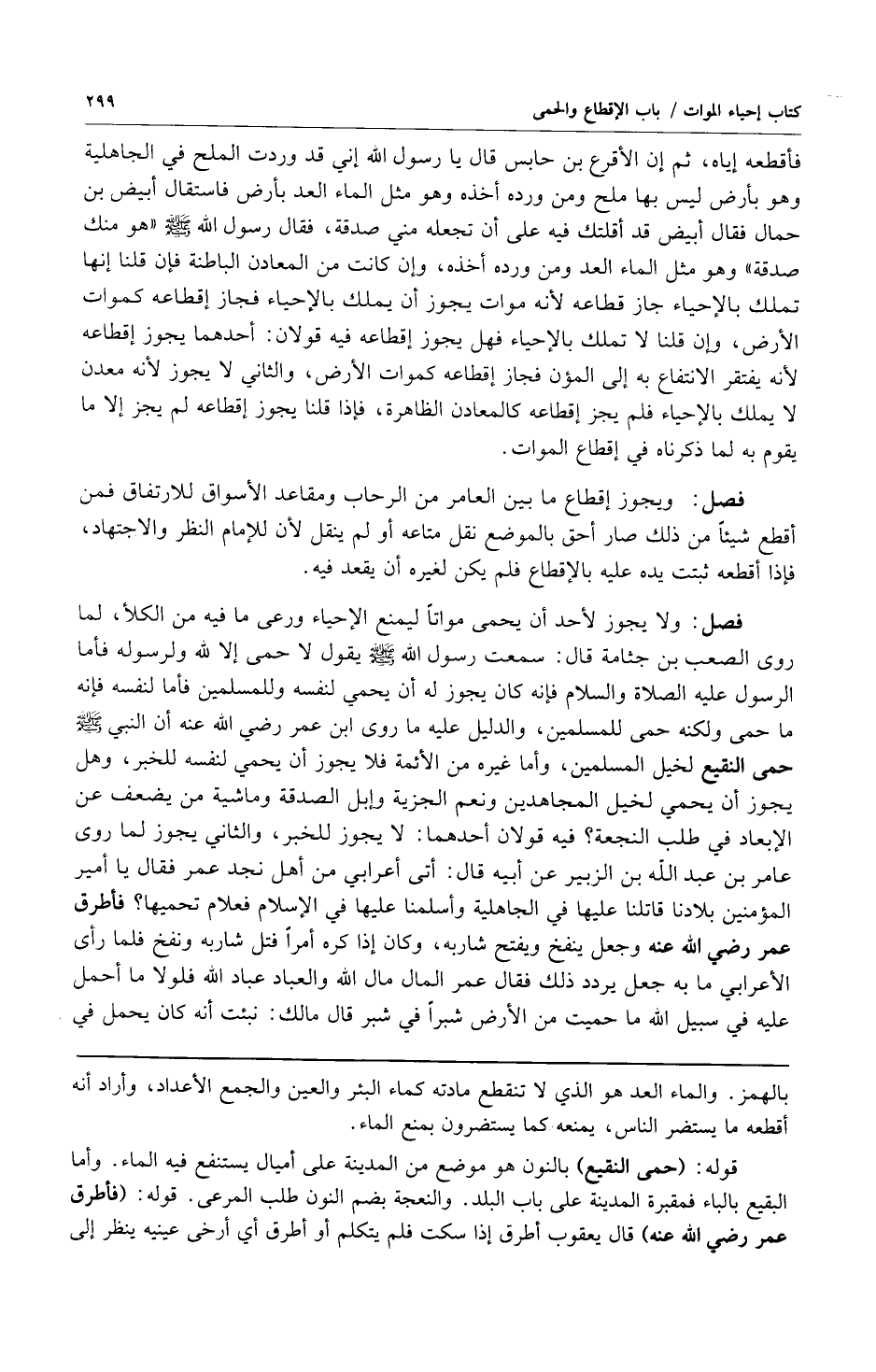 فصل: ولا يجوز لأحد أن يحمي مواتاً ليمنع الإحياء ورعى ما فيه من الكلأ لما روى الصعب بن جثامة قال: سمعت رسول الله صلى الله عليه وسلم يقول: "لا حمى إلا لله ولرسوله" فأما الرسول عليه الصلاة والسلام فإنه كان يجوز له أن يحمي لنفسه وللمسلمين فإما لنفسه فإنه ما حمى ولكنه حمى المسلمين والدليل عليه ما روى ابن عمر رضي الله عنه أن النبي صلى الله عليه وسلم حمى النقيع لخيل المسلمين وأما غيره من الأئمة فلا يجوز أن يحمي لنفسه للخبر وهل يجوز أن يحمي لخيل المجاهدين ونعم الجزية وإبل الصدقة وماشية من يضعف عن الإبعاد في طلب النجعة؟ فيه قولان أحدهما: لا يجوز للخبر والثاني يجوز لما روى عامر بن عبد الله بن الزبير عن أبيه قال: أتى أعرابي من أهل نجد عمر فقال يا أمير المؤمنين بلادنا قاتلنا عليها في الجاهلية وأسلمنا عليها في الإسلام فعلام تحميها؟ فأطرق عمر رضي الله عنه وجعل ينفخ ويفتح شاربه وكان إذا كره أمراً فتل شاربه ونفخ فلما رأى الأعرابي ما به جعل يردد ذلك فقال عمر المال مال الله والعباد عباد الله فلولا ما أحمل عليه في سبيل الله ما حميت من الأرض شبراً في شبر قال مالك: نبئت أنه كان يحمل في