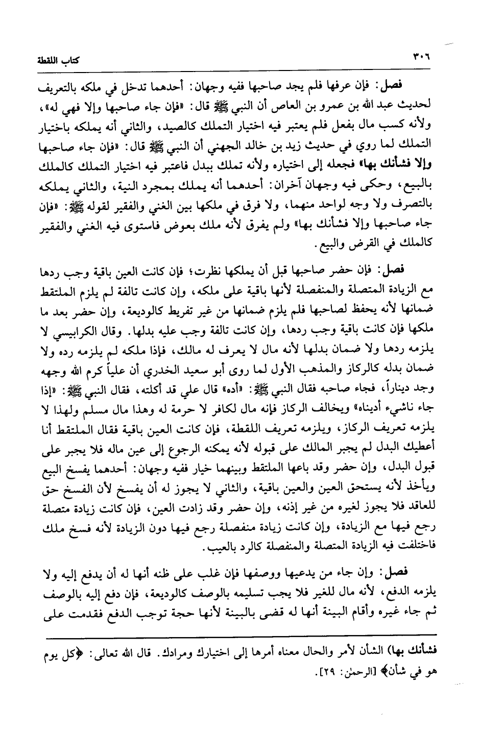 فصل: فإن عرفها فلم يجد صاحبها ففيه وجهان: أحدهما تدخل في ملكه بالتعريف لحديث عبد الله بن عمرو بن العاص أن النبي صلى الله عليه وسلم قال: "فإن جاء صاحبها وإلا فهي له" ولأنه كسب مال بفعل فلم يعتبر فيه اختيار التملك كالصيد والثاني أنه يملكه باختيار التملك لما روي في حديث زيد بن خالد الجهني أن النبي صلى الله عليه وسلم قال: "فإن جاء صاحبها وإلا فشأنك بها" فجعله إلى اختياره ولأنه تملك ببدل فاعتبر فيه اختيار التملك كالملك بالبيع وحكى فيه وجهان آخران: أحدهما أنه يملك بمجرد النية والثاني يملكه بالتصرف ولا وجه لواحد منهما ولا فرق في ملكها بين الغني والفقير لقوله صلى الله عليه وسلم: "فإن جاء صاحبها وإلا فشأنك بها" ولم يفرق لأنه ملك بعوض فاستوى فيه الغني والفقير كالملك في القرض والبيع.