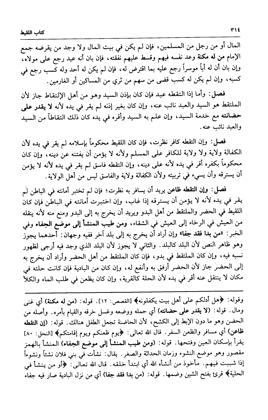 فصل: وإن التقطه ظاعن يريد أن يسافر به نظرت فإن لم تختبر أمانته في الباطن لم يقر في يده لأنه لا يؤمن أن يسترقه إذا غاب وإن اختبرت أمانته في الباطن فإن كان اللقيط في الحضر والملتقط من أهل البدو ويريد أن يخرج به إلى البدو ومنع منه لأنه ينقله من العيش في الرخاء إلى العيش في الشقاء ومن طيب المنشأ إلى موضع الجفاء وفي الخبر: من بدا فقد جفا وإن أراد أن يخرج به إلى بلد آخر ففيه وجهان: أحدهما يجوز وهو ظاهر النص لأن البلد كالبلد والثاني لا يجوز لأن البلد الذي وجد فيه أرجى لظهور نسبه فيه وإن كان الملتقط في بدو فإن كان الملتقط من أهل الحضر وأراد أن يخرج به إلى الحضر جاز لأن الحضر أرفق به وأنفع له وإن كان من البادية فإن كانت حلته في مكان لا ينتقل عنه أقر في يده لأن الحلة كالقرية وإن كان يظعن في طلب الماء والكلأ