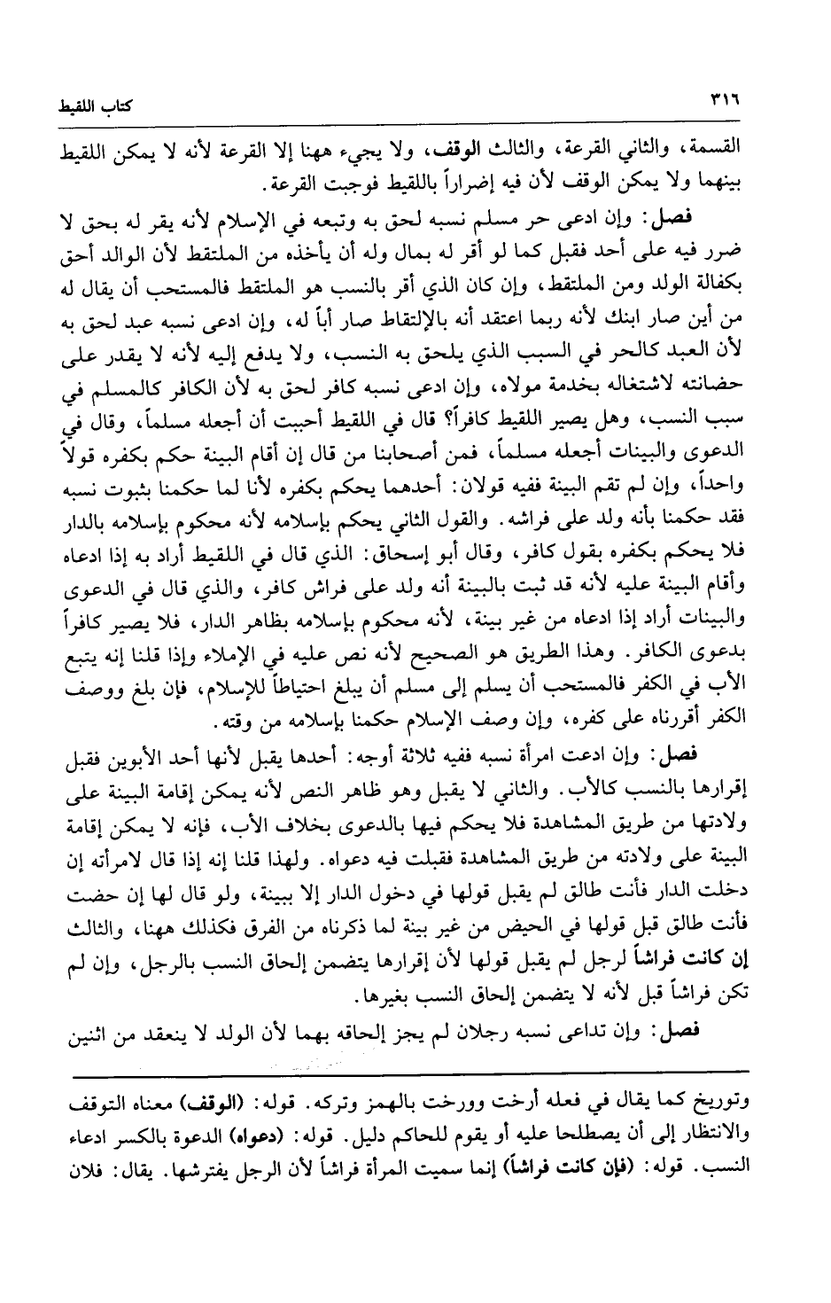 فصل: وإن ادعى حر مسلم نسبه لحق به وتبعه في الإسلام لأنه يقر له بحق لا ضرر فيه على أحد فقبل كما لو أقر له بمال وله أن يأخذه من الملتقط لأن الوالد أحق بكفالة الولد ومن الملتقط وإن كان الذي أقر بالنسب هو الملتقط فالمستحب أن يقال له من أين صار ابنك لأنه ربما اعتقد أنه بالإلتقاط صار أباً له وإن ادعى نسبه عبد لحق به لأن العبد كالحر في السبب الذي يلحق به النسب ولا يدفع إليه لأنه لا يقدر على حضانته لاشتغاله بخدمة مولاه وإن ادعى نسبه كافر لحق به لأن الكافر كالمسلم في سبب النسب وهل يصير اللقيط كافراً؟ قال في اللقيط أحببت أن أجعله مسلماً وقال في الدعوى والبينات أجعله مسلماً فمن أصحابنا من قال إن أقام البينة حكم بكفره قولاً واحداً وإن لم تقم البينة ففيه قولان: أحدهما يحكم بكفره لأنا لما حكمنا بثبوت نسبه فقد حكمنا بأنه ولد على فراشه والقول الثاني يحكم بإسلامه لأنه محكوم بإسلامه بالدار فلا يحكم بكفره بقول كافرن وقال أبو إسحاق: الذي قال في اللقيط أراد به إذا ادعاه وأقام البينة عليه لأنه قد ثبت بالبينة أنه ولد على فراش كافر والذي قال في الدعوى والبينات أراد إذا ادعاه من غير بينة لأنه محكوم بإسلامه بظاهر الدار فلا يصير كافراً بدعوى الكافر وهذا الطريق هو الصحيح لأنه نص عليه في الإملاء وإذا قلنا إنه يتبع الأب في الكفر فالمستحب أن يسلم إلى مسلم أن يبلغ احتياطاً للإسلام فإن بلغ ووصف الكفر أقررناه على كفره وإن وصف الإسلام حكمنا بإسلامه من وقته.