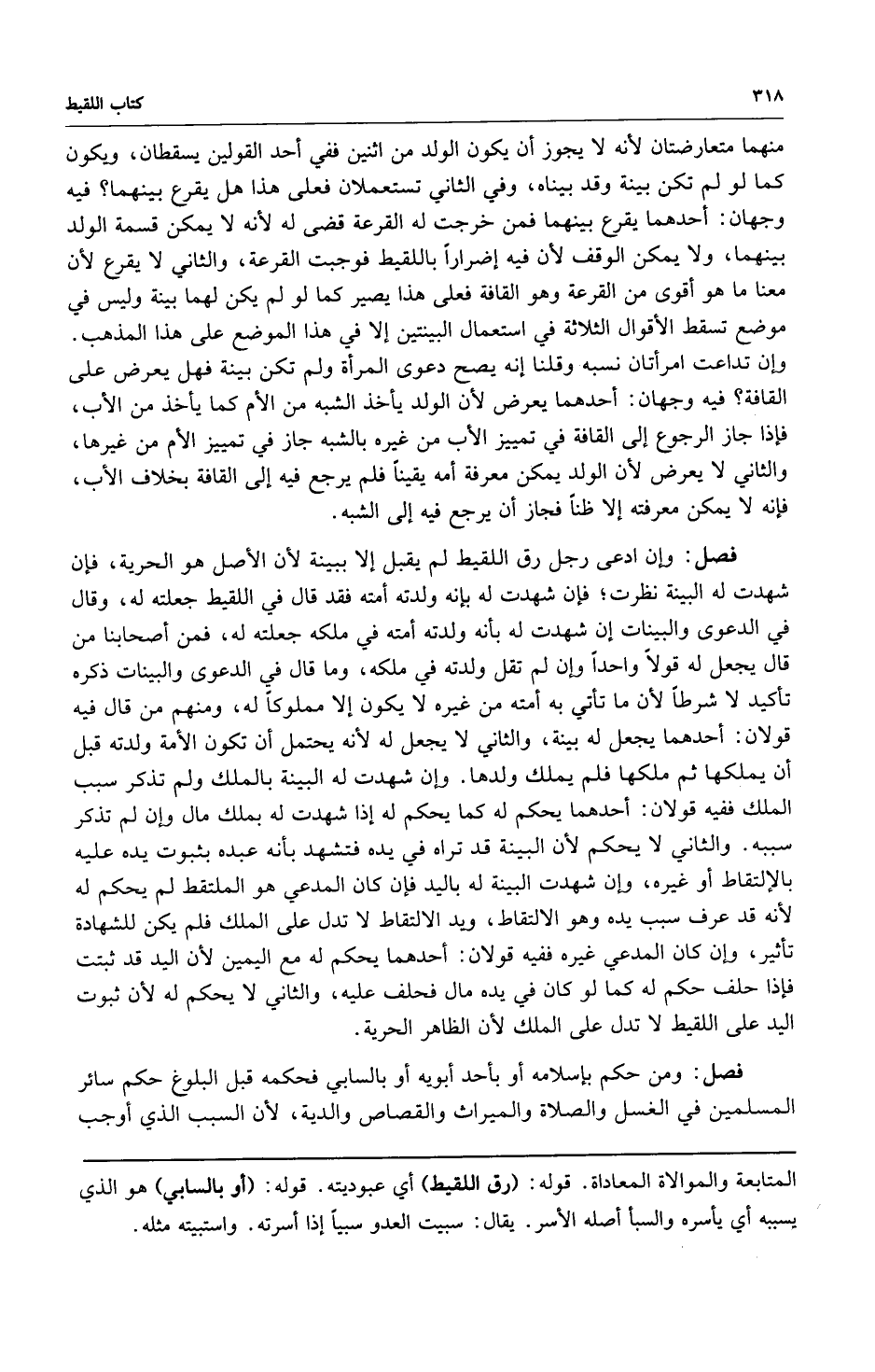 فصل: وإن ادعى رجل رق اللقيط لم يقبل إلا ببينة لأن الأصل هو الحرية فإن شهدت له البينة نظرت فإن شهدت له بأنه ولدته أمته فقد قال في اللقيط جعلته له وقال في الدعوى والبينات إن شهدت له بأنه ولدته أمته في ملكه جعلته له فمن أصحابنا من قال يجعل له قولاً واحداً وإن لم تقل ولدته في ملكه وما قال في الدعوى والبينات ذكره تأكيد لا شرطاً لأن ما تأتي به أمته من غيره لا يكون إلا مملوكاً له ومنهم من قال فيه قولان: أحدهما يجعل له بينة والثاني لا يجعل له لأنه يحتمل أن تكون الأمة ولدته قبل أن يملكها ثم ملكها فلم يملك ولدها وإن شهدت له البينة بالملك ولم تذكر سبب الملك ففيه قولان: أحدهما يحكم له كما يحكم له إذا شهدت له بملك مال وإن لم تذكر سببه والثاني لا يحكم لأن البينة قد تراه في يده فتشهد بأنه عبده بثبوت يده عليه بالإلتقاط أو غيره وإن شهدت البينة له باليد فإن كان المدعي هو الملتقط لم يحكم له لأنه قد عرف سبب يده وهو الإلتقاط ويد الإلتقاط لا تدل على الملك فلم يكن للشهادة تأثير وإن كان المدعي غيره ففيه قولان: أحدهما يحكم له مع اليمين لأن اليد قد ثبتت فإذا حلف حكم له كما لو كان في يده مال فحلف عليه والثاني لا يحكم له لأن ثبوت اليد على اللقيط لا تدل على الملك لأن الظاهر الحرية.