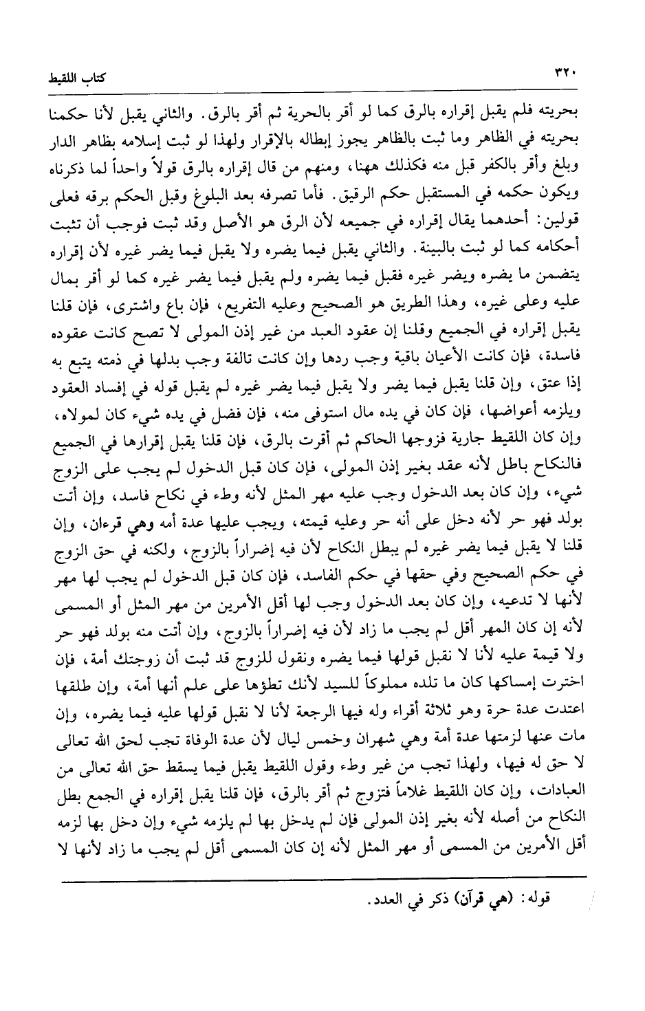 بحريته فلم يقبل إقراره بالرق كما لو أقر بالحرية ثم أقر بالرق والثاني يقبل لأنا حكمنا بحريته في الظاهر وما ثبت بالظاهر يجوز إبطاله بالإقرار ولهذا لو ثبت إسلامه بظاهر الدار وبلغ وأقر بالكفر قبل منه فكذلك ههنا ومنهم من قال إقراره بالرق قولاً واحداً لما ذكرناه ويكون حكمه في المستقبل حكم الرقيق فإما تصرفه بعد البلوغ وقبل الحكم برقه فعلى قولين: أحدهما يقال إقراره في جميعه لأن الرق هو الأصل وقد ثبت فوجب أن تثبت أحكامه كما لو ثبت بالبينة والثاني يقبل فيما يضره ولا يقبل فيما يضر غيره لأن إقراره يتضمن ما يضره ويضر غيره فقبل فيما يضره ولم يقبل فيما يضر غيره كما لو أقر بمال عليه وعلى غيره وهذا الطريق هو الصحيح وعليه التفريع فإن باع واشترى فإن قلنا يقبل إقراره في الجميع وقلنا إن عقود العبد من غير إذن المولى لا تصح كانت عقوده فاسدة فإن كانت الأعيان باقية وجب ردها وإن كانت تالفة وجب بدلها في ذمته يتبع به إذا عتق وإن قلنا يقبل فيما يضره ولا يقبل فيما يضر غيره لم يقبل قوله في إفساد العقود ويلزمه أعواضها فإن كان في يده مال استوفى منه فإن فضل في يده شيء كان لمولاه وإن كان اللقيط جارية فزوجها الحاكم ثم أقرت بالرق فإن قلنا يقبل إقرارها في الجميع فالنكاح باطل لأنه عقد بغير إذن المولى فإن كان قبل الدخول لم يجب على الزوج شيء وإن كان بعد الدخول وجب عليه مهر المثل لأنه وطء في نكاح فاسد وإن أتت بولد فهو حر لأنه دخل على أنه حر وعليه قيمته ويجب عليها عدة أمه وهي قرءان وإن قلنا لا يقبل فيما يضر غيره لم يبطل النكاح لأن فيه إضراراً بالزوج ولكنه في حق الزوج في حكم الصحيح وفي حقها في حكم الفاسد فإن كان قبل الدخول لم يجب لها مهر لأنها لا تدعيه وإن كان بعد الدخول وجب لها أقل الأمرين من مهر المثل أو المسمى لأنه إن كان المهر أقل لم يجب ما زاد لأن فيه إضراراً بالزوج وإن أتت منه بولد فهو حر ولا قيمة عليه لأنا لا نقبل قوله فيما يضره ونقول للزوج قد ثبت أن زوجتك أمة فإن اخترت إمساكها كان ما تلده مملوكاً للسيد لأنك تطؤها على علم أنها أمة وإن طلقها اعتدت عدة حرة وهو ثلاثة أقراء وله فيها الرجعة لأنا لا نقبل قولها عليه فيما يضره وإن مات عنها لزمته عدة أمة وهي شهران وخمس ليال لأن عدة الوفاة تجب لحق الله تعالى لا حق له فيها ولهذا تجب من غير وطء وقول اللقيط يقبل فيما يسقط حق الله تعالى من العبادات وإن كان اللقيط غلاماً فتزوج ثم أقر بالرق فإن قلنا يقبل إقراره في الجمع بطل النكاح من أصله لأنه بغير إذن المولى فإن لم يدخل بها لم يلزمه شيء وإن دخل بها لزمه أقل الأمرين من المسمى أو مهر المثل لأنه إن كان المسمى أقل لم يجب ما زاد لأنها لا
