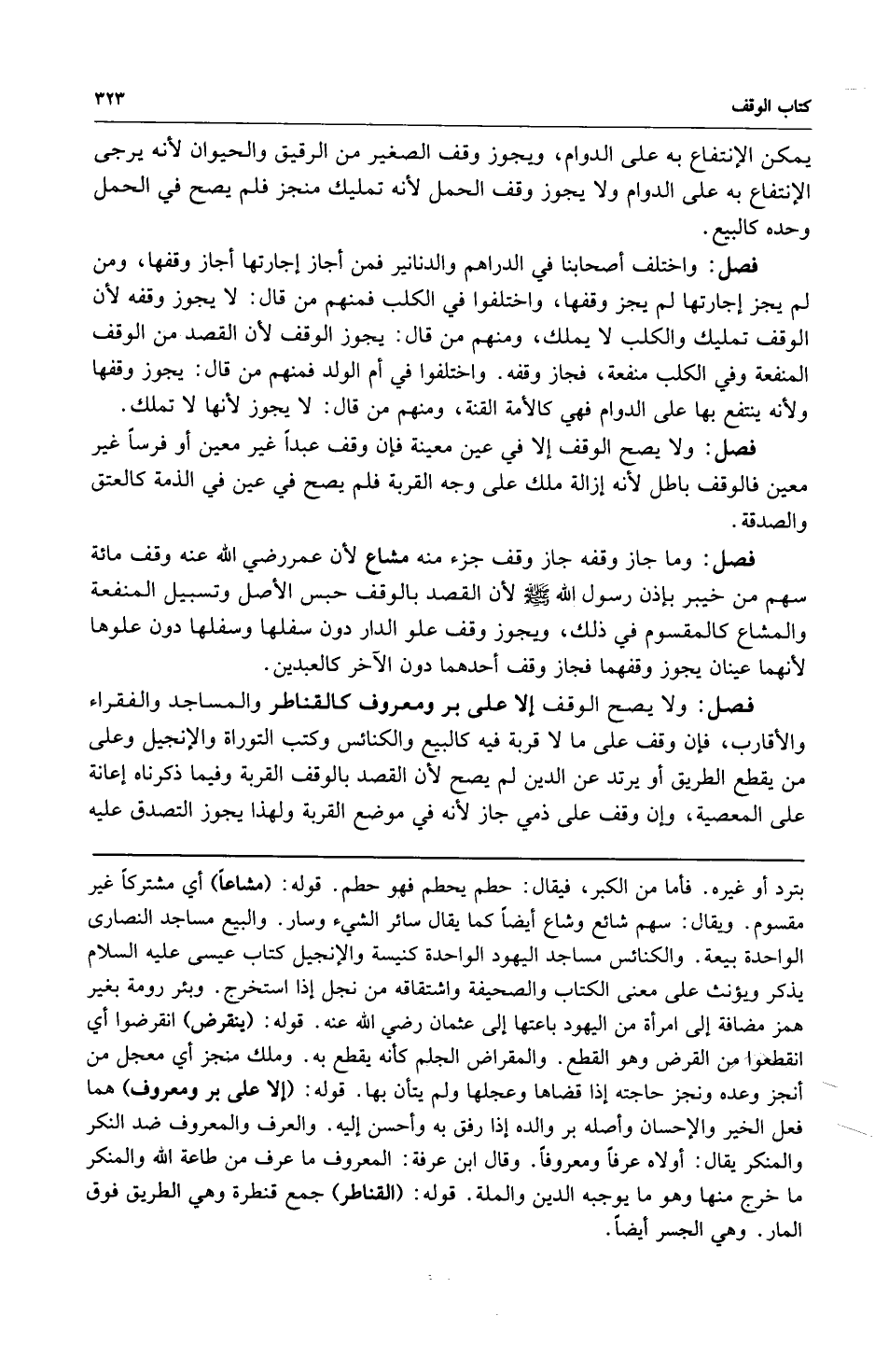 فصل: ولا يصح الوقف إلا على بر ومعروف كالقناطر والمساجد والفقراء والأقارب فإن وقف على ما لا قربة فيه كالبيع والكنائس وكتب التوراة والإنجيل وعلى من يقطع الطريق أو يرتد عن الدين لم يصح لأن القصد بالوقف القربة وفيما ذكرناه إعانة على المعصية وإن وقف على ذمي جاز لأنه في موضع القربة ولهذا يجوز التصدق عليه