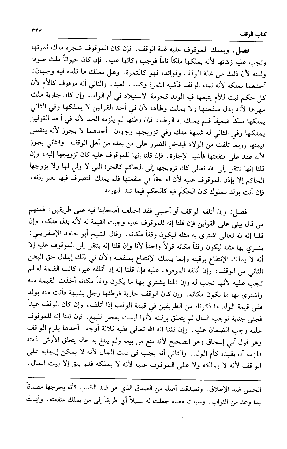 فصل: ويملك الموقوف عليه غلة الوقف فإن كان الموقوف شجرة ملك ثمرتها وتجب عليه زكاتها لأنه يملكها ملكاً تاماً فوجب زكاتها عليه فإن كان حيواناً ملك صوفه ولبنه لأن ذلك من غلة الوقف وفوائده فهو كالثمرة وهل يملك ماتلده فيه وجهان: أحدهما يملكه لأنه نماء الوقف فأشبه الثمرة وكسب العبد والثاني أنه موقوف كالأم لأن كل حكم ثبت فيه للأم يتبعه فيه الولد كحرمة الاستيلاد في أم الولد وإن كان جارية ملك مهرها لأنه بدل منفعتها ولا يملك وطأها لأنها في أحد القولين لا يملكها وفي الثاني يملكها ملكاً ضعيفاً فلم يملك به الوطأ فإن وطئها لم يلزمه الحد لأنه في أحد القولين يملكها وفي الثاني له شبهة ملك وفي تزويجها وجهان: أحدهما لا يجوز لأنه ينقص قيمتها وربما تلفت من الولاد فيدخل الضرر على من بعده من أهل الوقف والثاني يجوز لأنه عقد على منفعتها فأشبه الإجارة فإن قلنا إنها للموقوف عليه كان تزويجها إليه وإن قلنا إنها تنتقل إلى الله تعالى كان تزويجها إلى الحاكم كالحرة التي لا ولي لها ولا يزوجها الحاكم إلا بإذن الموقوف عليه لأن له حقاً في منفعتها فلم يملك التصرف فيها بغير إذنه فإن أتت بولد مملوك كان الحكم فيه كالحكم فيما تلد البهيمة.