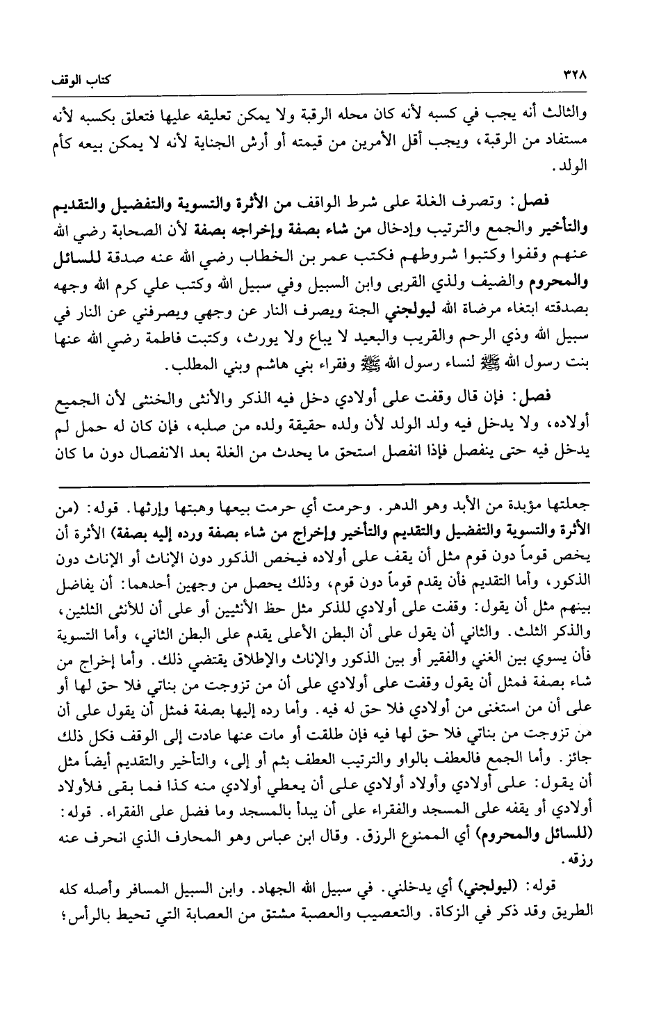 فصل: وتصرف الغلة على شرط الواقف من الأثرة والتسوية والتفضيل والتقديم والتأخير والجمع الترتيب وإدخال من شاء وإخراجه بصفة لأن الصحابة رضي الله عنهم وقفوا وكتبوا شروطهم فكتب عمر بن الخطاب رضي الله عنه صدقة للسائل والمحروم والضيف ولذي القربى وابن السبيل وفي سبيل الله وكتب علي كرم الله وجهه بصدقته ابتغاء مرضاة الله ليولجني الجنة ويصرف النار عن وجهي ويصرفني عن النار في سبيل الله وذي الرحم والقريب والبعيد لا يباع ولا يورث وكتبت فاطمة رضي الله عنها بنت رسول الله صلى الله عليه وسلم لنساء رسول الله صلى الله عليه وسلم وفقراء بني هاشم وبني المطلب.