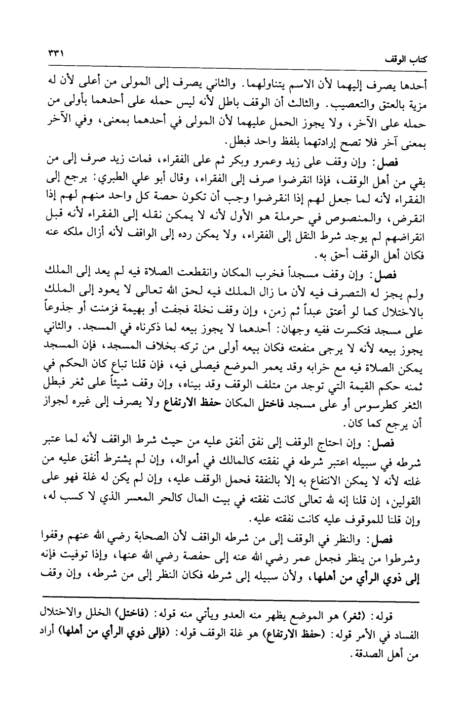 فصل: وإن وقف مسجداً فخرب المكان وانقطعت الصلاة فيه لم يعد إلى الملك ولم يجز له التصرف فيه لأن ما زال الملك فيه لحق الله تعالى لا يعود إلى الملك بالاختلال كما لو أعتق عبداً ثم زمن وإن وقف نخلة فجفت أو بهيمة فزمنت أو جذوعاً على مسجد فتكسرت ففيه وجهان: أحدهما لا يجوز بيعه لما ذكرناه في المسجد والثاني يجوز بيعه لأنه لا يرجى منفعته فكان بيعه أولى من تركه بخلاف المسجد فإن المسجد يمكن الصلاة فيه مع خرابه وقد يعمر الموضع فيصلى فيه فإن قلنا تباع كان الحكم في ثمنه حكم القيمة التي توجد من متلف الوقف وقد بيناه وإن وقف شيئاً على ثغر فبطل الثغر كطرسوس أو على مسجد فاختل المكان حفظ الارتفاع ولا يصرف إلى غيره لجواز أن يرجع كما كان.