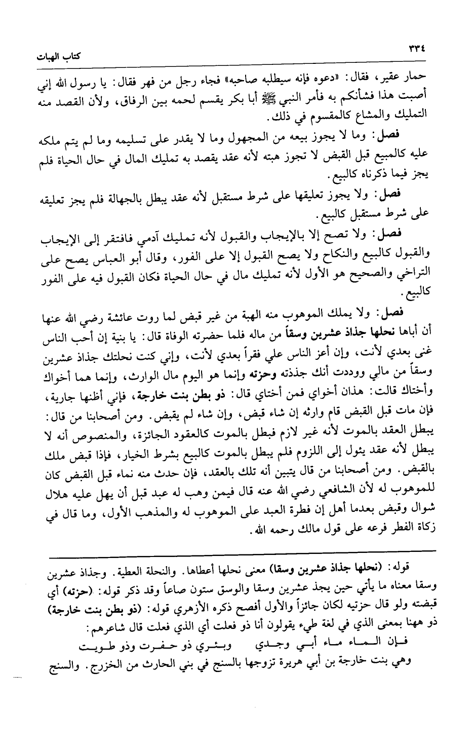 فصل: ولا يملك الموهوب منه الهبة من غير قبض لما روت عائشة رضي الله عنها أن أباها نحلها جذاذ عشرين وسقاً من ماله فلما حضرته الوفاة قال: يا بنية إن أحب الناس غنى بعدي لأنت وإن أعز الناس علي فقراً بعدي لأنت وإن كنت نحلتك جذاذ عشرين وسقاً من مالي ووددت أنك جذذته وحزته وإنما هو اليوم مال الوارث وإنما هو أخواك وأختاك قالت: هذان أخواي فمن أختاي قال: ذو بطن بنت خارجة فإني أظنها جارية فإن مات قبل القبض قام وارثه إن شاء قبض وإن شاء لم يقبض ومن أصحابنا من قال: يبطل العقد بالموت لأنه غير لازم فبطل بالموت كالعقود الجائزة والمنصوص أنه لا يبطل لأنه عقد يئول إلى اللزوم فلم يبطل بالموت كالبيع بشرط الخيار فإذا قبض ملك بالقبض ومن أصحابنا من قال يتبين أنه تلك بالعقد فإن حدث منه نماء قبل القبض كان للموهوب له لأن الشافعي رضي الله عنه قال فيمن وهب له عبد قبل أن يهل عليه هلال شوال وقبض بعدما أهل إن فطرة العبد على الموهوب له والمذهب الأول وما قال في زكاة الفطر فرعه على قول مالك رحمه الله.