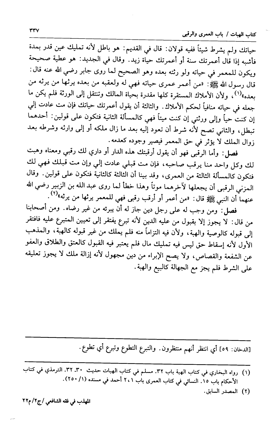 1 رواه البخاري في كتاب الهبة باب 32. مسلم في كتاب الهبات حديث 30 - 32. الترمذي في كتاب الأحكام باب 15. النسائي في كتاب العمري باب 1،2. أحمد في مسنده "1/250".