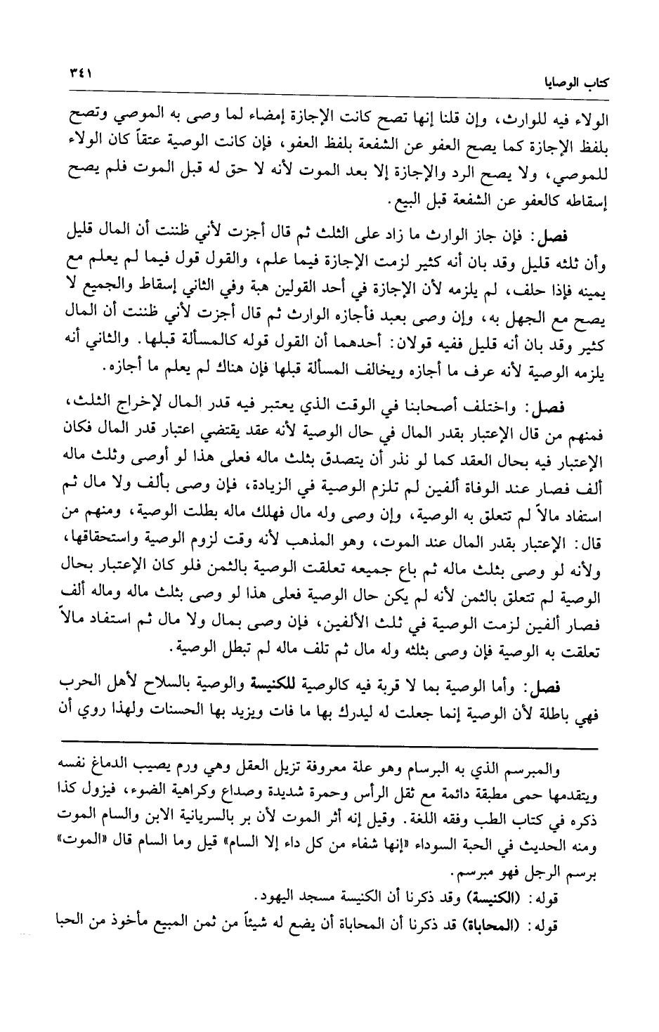 فصل: وأما الوصية بما لا قربة فيه كالوصية للكنيسة والوصية بالسلاح لأهل الحرب فهي باطلة لأن الوصية إنما جعلت له ليدرك بها ما فات ويزيد بها الحسنات ولهذا روي أن