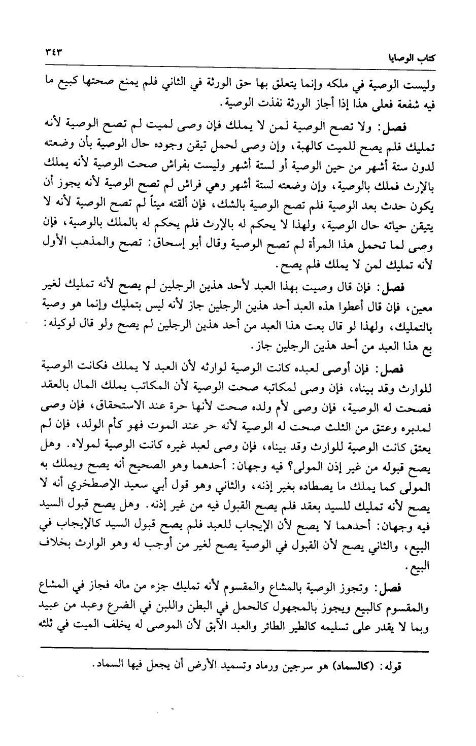 فصل: وتجوز الوصية بالمشاع والمقسوم لأنه تمليك جزء من ماله فجاز في المشاع والمقسوم كالبيع ويجوز بالمجهول كالحمل في البطن واللبن في الضرع وعبد من عبيد وبما لا يقدر على تسليمه كالطير الطائر والعبد الآبق لأن الموصى له يخلف الميت في ثلثه