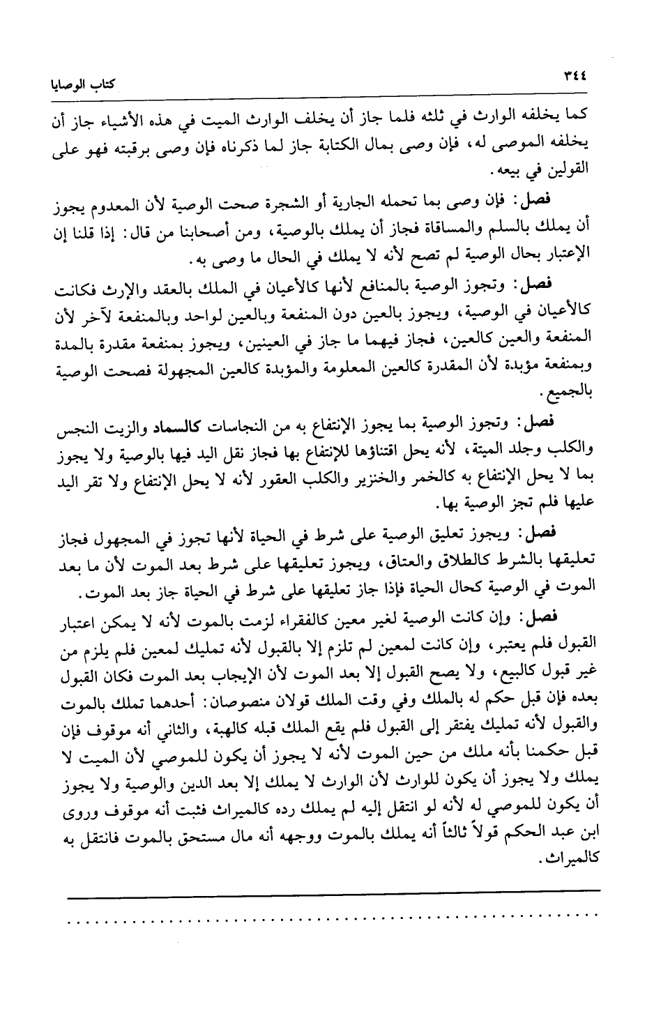 فصل: فإن وصى بما تحمله الجارية أو الشجرة صحت الوصية لأن المعدوم يجوز أن يملك بالسلم والمساقاة فجاز أن يملك بالوصية ومن أصحابنا من قال: إذا قلنا إن الإعتبار بحال الوصية لم تصح لأنه لا يملك في الحال ما وصى به.