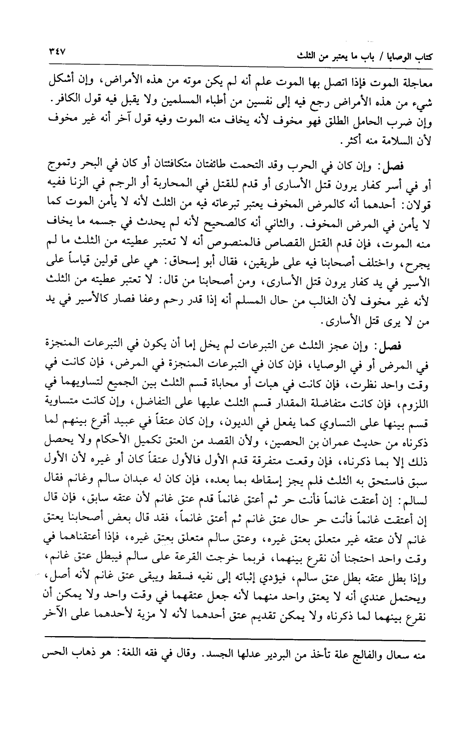 فصل: وإن كان في الحرب وقد التحمت طائفتان متكافئتان أو كان في البحر وتموج أو في أسر كفار يرون قتل الأسارى أو قدم للقتل في المحاربة أو الرجم في الزنا ففيه قولان: أحدهما أنه كالمرض المخوف يعتبر تبرعاته فيه من الثلث لأنه لا يأمن الموت كما لا يأمن في المرض المخوف والثاني أنه كالصحيح لأنه لم يحدث في جسمه ما يخاف منه الموت فإن قدم القتل القصاص فالمنصوص أنه لا تعتبر من الثلث ما لم يجرح واختلف أصحابنا فيه على طريقين فقال أبو إسحاق: هي على قولين قياساً على الأسير في يد كفار يرون قتل الأسارى ومن أصحابنا من قال: لا تعتبر عطيته من الثلث لأنه غير مخوف لأن الغالب من حال المسلم أنه إذا قدر رحم وعفا فصار كالأسير في يد من لا يرى قتل الأسارى.