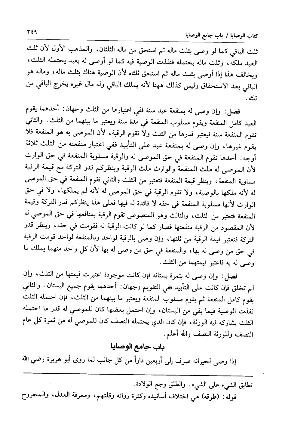 فصل: وإن وصى له بمنفعة عبد سنة ففي اعتبارها من الثلث وجهان: أحدهما يقوم العبد كامل المنفعة ويقوم مسلوب المنفعة في مدة سنة ويعتبر ما بينهما من الثلث والثاني تقوم المنفعة سنة فيعتبر قدرها من الثلث ولا تقوم الرقبة لأن الموصى به هو المنفعة فلا يقوم غيرها وإن وصى له بمنفعة عبد على التأبيد ففي اعتبار منفعته من الثلث ثلاثة أوجه: أحدها تقوم المنفعة في حق الموصى له والرقبة مسلوبة المنفعة في حق الوارث لأن الموصى له ملك المنفعة والوارث ملك الرقبة وينظر كم قدر التركة مع قيمة الرقبة مساوية المنفعة وينظر قيمة المنفعة فتعتبر من الثلث والثاني تقوم المنفعة في حق الموصى له لأنه ملكها بالوصية ولا تقوم الرقبة في حق الموصى له لأنه لم يملكها ولا في حق الوارث لأنها مسلوبة المنفعة في حقها لا فائدة له فيها فعلى هذا ينظر كم قدر التركة وقيمة المنفعة فتعتبر من الثلث والثالث وهو المنصوص تقوم الرقبة بمنافعها في حق الموصي له لأن المقصود من الرقبة منفعتها فصار كما لو كانت الرقبة له فقومت في حقه وينظر قدر التركة فتعتبر قيمة الرقبة من ثلثه وإن وصى بالرقبة لواحد وبالمنفعة لواحد قومت الرقبة في حق من وصى له بها والمنفعة في حق من وصى له بها لأن كل واحد منهما يملك ما وصى له به فاعتبر قيمتهما من الثلث.