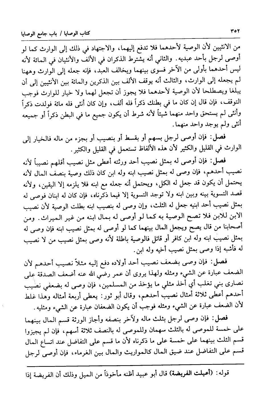 فصل: فإن وصى بضعف نصيب أحد أولاده دفع إليه مثلاً نصيب أحدهم لأن الضعف عبارة عن الشيء ومثله ولهذا يروى أن عمر رضي الله عنه أضعف الصدقة على نصارى بني تغلب أي أخذ مثلي ما يؤخذ من المسلمين فإن وصى له بضعفي نصيب أحدهم أعطى ثلاثة أمثال نصيب أحدهم وقال أبو ثور: يعطي أربعة أمثاله وهذا غلط لأن الضعف عبارة عن الشيء ومثله فوجب أن يكون الضعفان عبارة عن الشيء ومثليه.