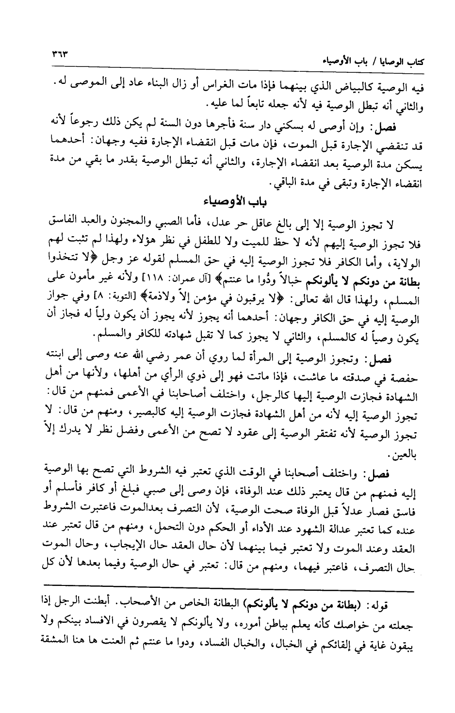 لا تجوز الوصية إلا إلى بالغ عاقل حر عدل فأما الصبي والمجنون والعبد الفاسق فلا تجوز الوصية إليهم لأنه لا حظ للميت ولا للطفل في نظر هؤلاء ولهذا لم تثبت لهم الولاية وأما الكافر فلا تجوز الوصية إليه في حق المسلم لقوله عز وجل: {لا تَتَّخِذُوا بِطَانَةً مِنْ دُونِكُمْ لا يَأْلُونَكُمْ خَبَالاً وَدُّوا مَا عَنِتُّمْ} [آل عمران: 118] ولأنه غير مأمون على المسلم ولهذا قال الله تعالى: {لا يَرْقُبُونَ فِي مُؤْمِنٍ إِلّاً وَلا ذِمَّةً} [التوبة: 8] وفي جواز الوصية إليه في حق الكافر وجهان: أحدهما أنه يجوز لأنه يجوز أن يكون ولياً له فجاز أن يكون وصياً له كالمسلم والثاني لا يجوز كما لا تقبل شهادته للكافر والمسلم.