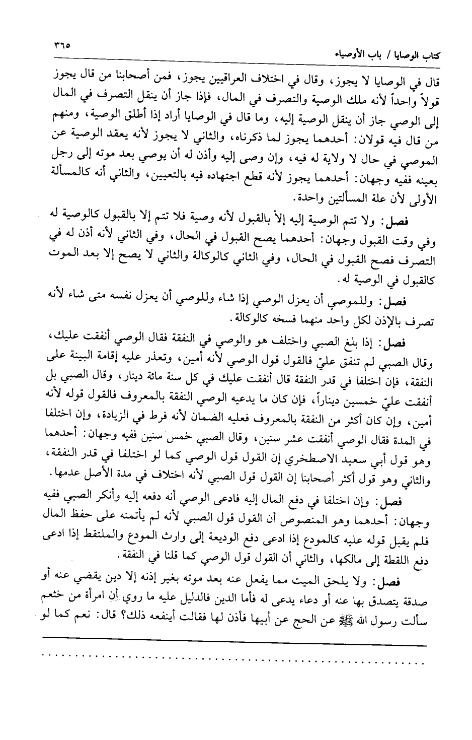 فصل: إذا بلغ الصبي واختلف هو والوصي في النفقة فقال الوصي أنفقت عليك وقال الصبي لم تنفق علي فالقول قول الوصي لأنه أمين وتعذر عليه إقامة البينة على النفقة فإن اختلفا في قدر النفقة قال أنفقت عليك في كل سنة مائة دينار وقال الصبي بل أنفقت علي خمسين ديناراً فإن كان ما يدعيه الوصي النفقة بالمعروف فالقول قوله لأنه أمين وإن كان أكثر من النفقة بالمعروف فعليه الضمان لأنه فرط في الزيادة وإن اختلفا في المدة فقال الوصي أنفقت عشر سنين وقال الصبي خمس سنين ففيه وجهان: أحدهما وهو قول أبي سعيد الاصطخري إن القول قول الوصي كما لو اختلفنا في قدر النفقة والثاني وهو قول أكثر أصحابنا إن القول قول الصبي لأنه اختلاف في مدة الأصل عدمها.