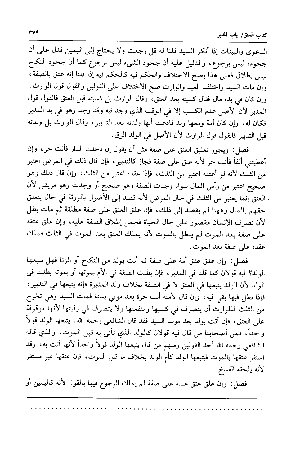 الدعوى والبينات إذا أنكر السيد قلنا له قل رجعت ولا يحتاج إلى اليمين فدل على أن جحوده ليس برجوع والدليل عليه أن جحود الشيء ليس برجوع كما أن جحود النكاح ليس بطلاق فعلى هذا يصح الاختلاف والحكم فيه كالحكم فيه إذا قلنا إنه عتق الصفة وإن مات السيد واختلف العبد والوارث صح الاختلاف على القولين والقول قول الوارث وإن كان في يده مال فقال كسبته بعد العتق وقال الوارث بل كسبته قبل العتق فالقول قول المدبر لأن الأصل عدم الكسب إلا في الوقت الذي وجد فيه وقد وجد وهو في يد المدبر فكان له وإن كان أمة ومعها ولد فادعت أنها ولدته بعد التدبير وقال الوارث بل ولدته قبل التدبير فالقول قول الوارث لأن الأصل في الولد الرق.