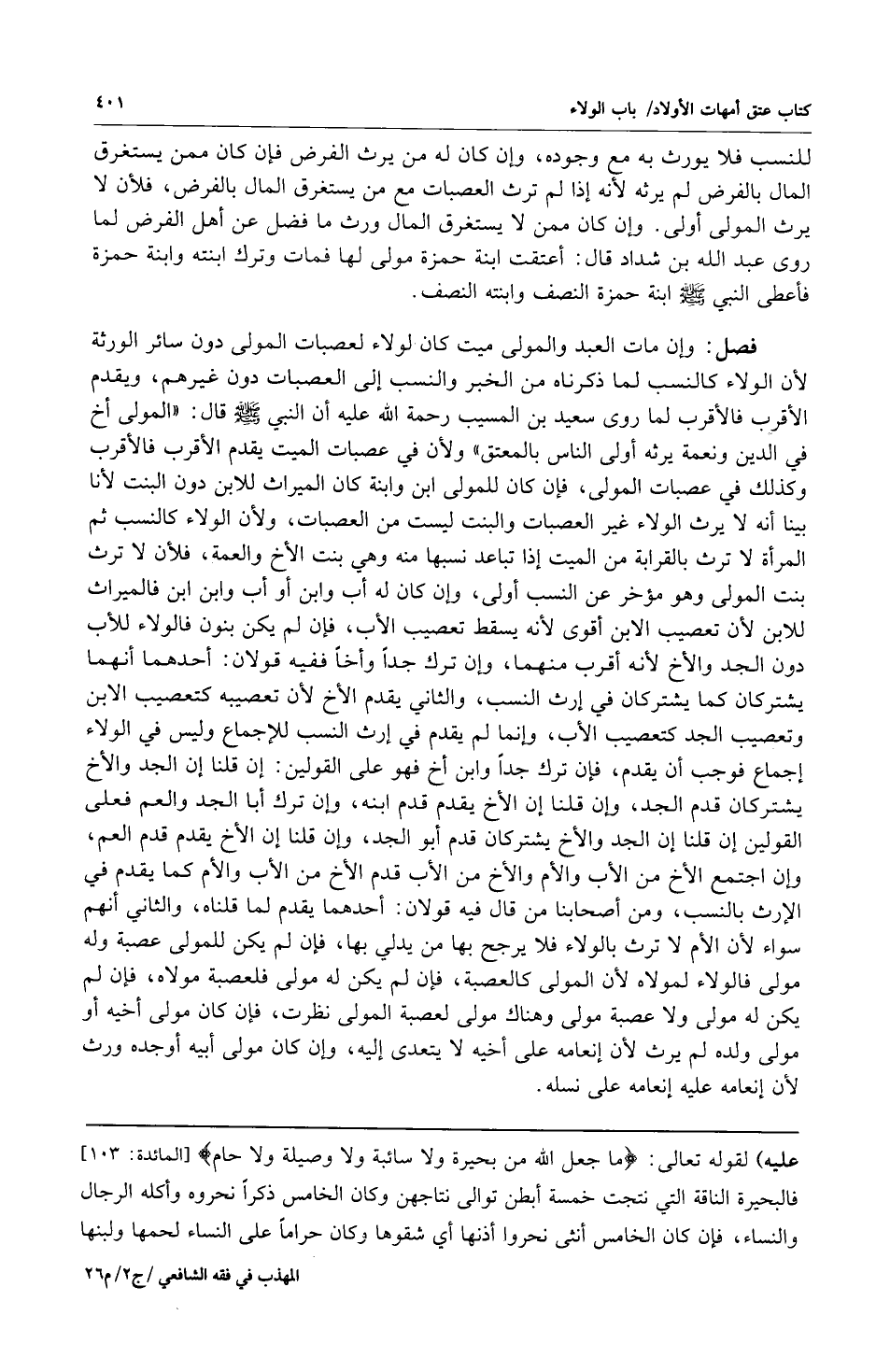 فصل: وإن مات العبد والمولى ميت كان الولاء لعصبات المولى دون سائر الورثة لأن الولاء كالنسب لما ذكرناه من الخبر والنسب إلى العصبات دون غيرهم ويقدم الأقرب فالأقرب لما روى سعيد بن المسيب رحمة الله عليه أن النبي صلى الله عليه وسلم قال: "المولى أخ في الدين ونعمة يرثه أولى الناس بالمعتق" ولأن في عصبات الميت يقدم الأقرب فالأقرب وكذلك في عصبات المولى فإن كان للمولى ابن وابنة كان الميراث للابن دون البنت لأنا بينا أنه لايرث الولاء غير العصبات والبنت ليست من العصبات ولأن الولاء كالنسب ثم المرأة لا ترث بالقرابة من الميت إذا تباعد نسبها منه وهي بنت الأخ والعمة فلأن لا ترث بنت المولى وهو مؤخر عن النسب أولى وإن كان له أب وابن أو أب وابن ابن فالميراث للابن لأن تعصيب الابن أقوى لأنه يسقط تعصيب الأب فإن لم يكن بنون فالولاء للأب دون الجد والأخ لأنه أقرب منهما وإن ترك جداً وأخاً ففيه قولان: أحدهما أنهما يشتركان كما يشتركان في إرث النسب والثاني يقدم الأخ لأن تعصيبه كتعصيب الابن وتعصيب الجد كتعصيب الأب وإنما لم يقدم في إرث النسب للإجماع وليس في الولاء إجماع فوجب أن يقدم فإن ترك جداً وابن أخ فهو على القولين: إن قلنا إن الجد والأخ يشتركان قدم الجد وإن قلنا إن الأخ يقدم قدم ابنه وإن ترك أبا الجد والعم فعلى القولين إن قلنا أن الجد والأخ يشتركان قدم أبو الجد وإن قلنا إن الأخ يقدم قدم العم وإن اجتمع الأخ من الأب والأم والأخ من الأب قدم الأخ من الأب والأم كما يقدم في الإرث في النسب ومن أصحابنا من قال فيه قولان: أحدهما يقدم لما قلناه والثاني أنهم سواء لأن الأم لا ترث بالولاء فلا يرجح بها من يدلي بها فإن لم يكن للمولى عصبة وله مولى فالولاء لمولاه لأن المولى كالعصبة فإن لم يكن له مولى فلعصبة مولاه فإن لم يكن له مولى ولا عصبة مولى وهناك مولى لعصبة المولى نظرت فإن كان مولى أخيه أو مولى ولده لم يرث لأن إنعامه على أخيه لا يتعدى إليه وإن كان مولى أبيه أو جده ورث لأن إنعامه عليه إنعامه على نسله.
