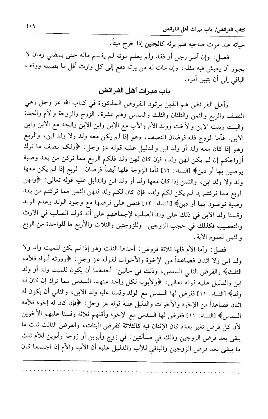 وأهل الفرائض هم الذين يرثون الفروض المذكورة في كتاب الله عز وجل وهي النصف والربع والثمن والثلثان والثلث والسدس وهم عشرة: الزوج والزوجة والأم والجدة والبنت وبنت الابن والأخت وولد الأم والأب مع الابن وابن الابن والجد مع الابن وابن الابن فأما الزوج فله فرضان النصف وهو إذا لم يكن معه ولد أو ولد ابن والربع وهو إذا كان معه ولد أو ولد ابن والدليل عليه قوله عز وجل: {وَلَكُمْ نِصْفُ مَا تَرَكَ أَزْوَاجُكُمْ إِنْ لَمْ يَكُنْ لَهُنَّ وَلَدٌ فَإِنْ كَانَ لَهُنَّ وَلَدٌ فَلَكُمُ الرُّبُعُ مِمَّا تَرَكْنَ مِنْ بَعْدِ وَصِيَّةٍ يُوصِينَ بِهَا أَوْ دَيْنٍ} [النساء: 12] فأما الزوجة فلها أيضاً فرضان: الربع إذا لم يكن معها ولد ولا ولد ابن والثمن إذا كان معها ولد أو ولد ابن والدليل عليه قوله تعالى: {وَلَهُنَّ الرُّبُعُ مِمَّا تَرَكْتُمْ إِنْ لَمْ يَكُنْ لَكُمْ وَلَدٌ فَإِنْ كَانَ لَكُمْ وَلَدٌ فَلَهُنَّ الثُّمُنُ مِمَّا تَرَكْتُمْ مِنْ بَعْدِ وَصِيَّةٍ تُوصُونَ بِهَا أَوْ دَيْنٍ} [النساء: 12] فنص على فرضها مع وجود الولد وعدم الولد وقسنا ولد الابن في ذلك على ولد الصلب لإجماعهم على أنه كولد الصلب في الإرث والتعصيب فكذلك في حجب الزوجين وللزوجتين والثلاث والأربع ما للواحدة من الربع والثمن لعموم الآية.