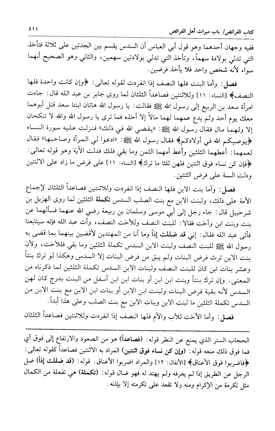 فصل: وأما البنت فلها النصف إذا انفردت لقوله تعالى: {وَإِنْ كَانَتْ وَاحِدَةً فَلَهَا النِّصْفُ} [النساء: 11] وللاثنتين فصاعداً الثلثان لما روى جابر بن عبد الله قال: جاءت امرأة سعد بن الربيع إلى رسول الله صلى الله عليه وسلم فقالت: يا رسول الله هاتان ابنتا سعد قتل أبوهما معك يوم أحد ولم يدع عمهما لهما مالاً إلا أخذه فما ترى يارسول الله والله لا تنكحان إلا ولهما مال فقال رسول الله صلى الله عليه وسلم: "يقضي الله في ذلك" فنزلت عليه سورة النساء: {يُوصِيكُمُ اللَّهُ فِي أَوْلادِكُمْ} فقال رسول الله صلى الله عليه وسلم: "ادعوا لي المرأة وصاحبها" فقال لعمهما أعطهما الثلثين وأعط أمهما الثمن وما بقي فلك فدلت الآية وهو قوله تعالى: {فَإِنْ كُنَّ نِسَاءً فَوْقَ اثْنَتَيْنِ فَلَهُنَّ ثُلُثَا مَا تَرَكَ} [النساء: 11] على فرض ما زاد على الاثنتين ودلت السنة على فرض الثنتين.