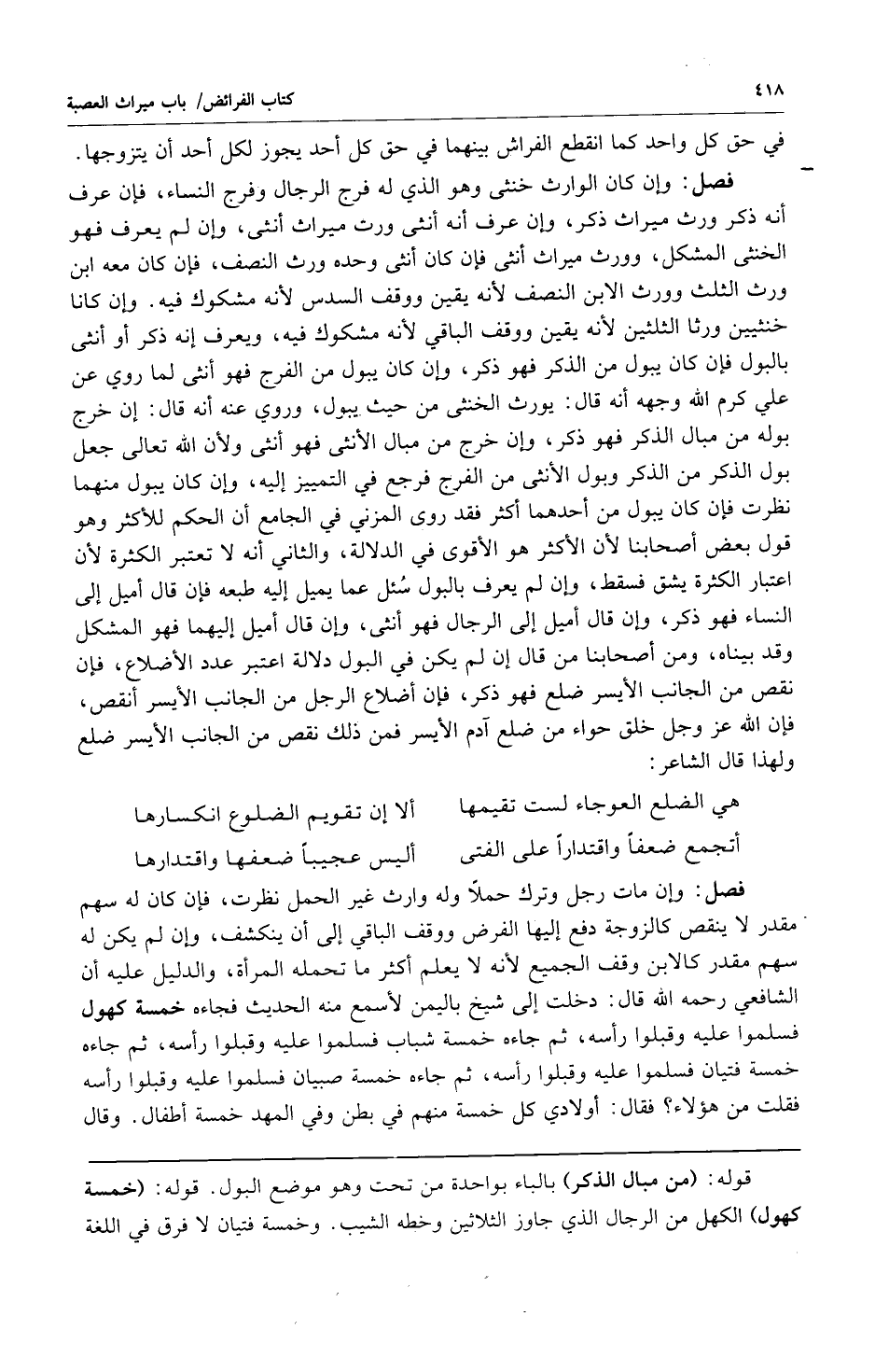 فصل: وإن كان الوارث خنثى وهو الذي له فرج الرجال وفرج النساء فإن عرف أنه ذكر ورث ميراث الذكر وإن عرف أنه أنثى ورث ميراث الأنثى وإن لم يعرف فهو الخنثى المشكل وورث ميراث أنثى فإن كان أنثى وحده ورث النصف فإن كان معه ابن ورث الثلث وورث الابن النصف لأنه يقين ووقف السدس لأنه مشكوك فيه وإن كانا خنثيين ورثا الثلثين لأنه يقين ووقف الباقي لأنه مشكوك فيه ويعرف أنه ذكر أو أنثى بالبول فإن كان يبول من الذكر فهو ذكر وإن كان يبول من الفرج فهو أنثى لما روي عن علي كرم الله وجهه أنه قال: يورث الخنثى من حيث يبول وروي عنه أنه قال: إن خرج بوله من مبال الذكر فهو ذكر وإن خرج من مبال الأنثى فهو أنثى ولأن الله تعالى جعل بول الذكر من الذكر وبول الأنثى من الفرج فرجع في التمييز إليه وإن كان يبول منهما نظرت فإن كان يبول من أحدهما أكثر فقد روى المزني في الجامع أن الحكم للأكثر وهو قول بعض أصحابنا لأن الأكثر هو الأقوى في الدلالة والثاني أنه لا تعتبر الكثرة لأن اعتبار الكثرة يشق فسقط وإن لم يعرف بالبول سئل عما يميل إليه طبعه فإن قال أميل إلى النساء فهو ذكر وإن قال أميل إلى الرجال فهو أنثى وإن قال أميل إليهما فهو المشكل وقد بيناه ومن أصحابنا من قال إن لم يكن في البول دلالة اعتبر عدد الأضلاع فإن نقص من الجانب الأيسر ضلع فهو ذكر فإن أضلاع الرجل من الجانب الأيسر أنقص فإن الله عز وجل خلق حواء من ضلع آدم الأيسر فمن ذلك نقص من الجانب الأيسر ضلع ولهذا قال الشاعر:
