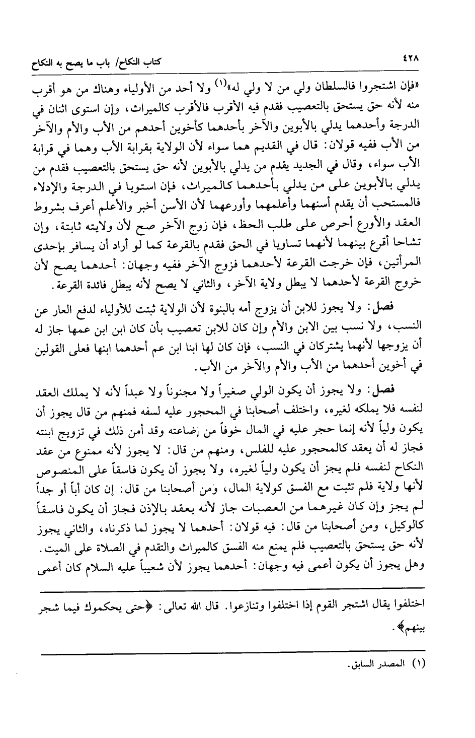 "فإن اشتجروا فالسلطان ولي من لا ولي له1" ولا أحد من الأولياء وهناك من هو أقرب منه لأنه حق يستحق بالتعصيب فقدم فيه الأقرب فالأقرب كالميراث وإن استوى اثنان في الدرجة وأحدهما يدلي بالأبوين والآخر بأحدهما كأخوين أحدهم من الأب والأم والآخر من الأب ففيه قولان: قال في القديم هما سواء لأن الولاية بقرابة الأب وهما في قرابة الأب سواء وقال في الجديد يقدم من يدلي في الأبوين لأنه حق يستحق بالتعصيب فقدم من يدلي بالأبوين على من يدلي بأحدهما كالميراث فإن استويا في الدرجة والإدلاء فالمستحب أن يقدم أسنهما وأعلمهما وأورعهما لأن الأسن أخبر والأعلم أعرف بشروط العقد والأورع أحرص على طلب الحظ فإن زوج الآخر صح لأن ولايته ثابتة وإن تشاحا أقرع بينهما لأنهما تساويا في الحق فقدم بالقرعة كما لو أراد أن يسافر بإحدى المرأتين فإن خرجت القرعة لأحدهما فزوج الآخر ففيه وجهان: أحدهما يصح لأن خروج القرعة لأحدهما لا يبطل ولاية الآخر والثاني لا يصح لأنه يبطل فائدة القرعة.