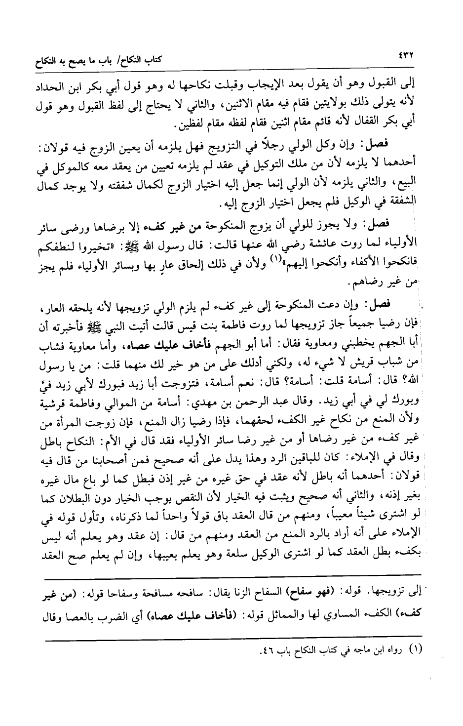فصل: وإن دعت المنكوحة إلى غير كفء لم يلزم الولي تزويجها لأنه يلحقه العار فإن رضيا جميعاً جاز تزويجها لما روت فاطمة بنت قيس قالت أتيت النبي صلى الله عليه وسلم فأخبرته أن أبا الجهم يخطبني ومعاوية فقال: "أما أبو الجهم فأخاف عليك عصاه وأما معاوية فشاب من شباب قريش لا شيء له ولكني أدلك على من هو خير لك منهما" قلت: من يا رسول الله؟ قال: "أسامة" قلت: أسامة؟ قال: "نعم أسامة فتزوجي أبا زيد فبورك لأبي زيد في وبورك لي في أبي زيد" وقال عبد الرحمن بن مهدي: أسامة من الموالي وفاطمة قرشية ولأن المنع من نكاح غير الكفء لحقهما فإن رضيا زال المنع فإن زوجت المرأة من غير كفء من غير رضاها أو من غير رضا سائر الأولياء فقد قال في الأم: النكاح باطل وقال في الإملاء: كان للباقين الرد وهذا يدل على أنه صحيح فمن أصحابنا من قال فيه قولان: أحدهما أنه باطل لأنه عقد في حق غيره من غير إذن فبطل كما لو باع مال غيره بغير إذنه والثاني أنه صحيح ويثبت فيه الخيار لأن النقص يوجب الخيار دون البطلان كما لو اشترى شيئاً معيباً ومنهم من قال العقد باق قولاً واحداً لما ذكرناه وتأول قوله في الإملاء على أنه أراد بالرد المنع من العقد ومنهم من قال: إنه عقد وهو يعلم أنه ليس بكفء بطل العقد كما لو اشترى الوكيل سلعة وهو يعلم بعيبها وإن لم يعلم صح العقد