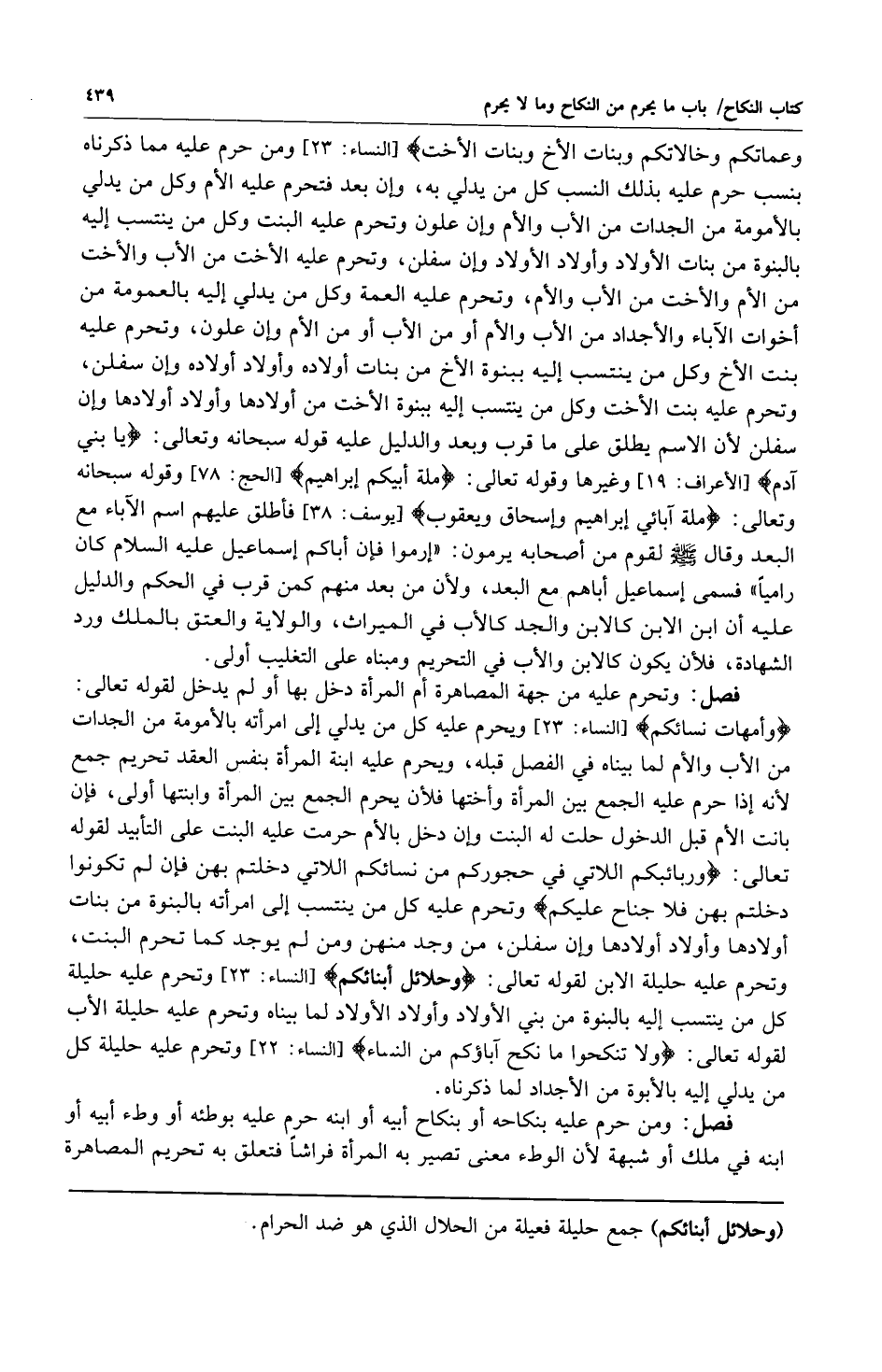 فصل: وتحرم عليه من جهة المصاهرة أم المرأة دخل بها أم لم يدخل لقوله تعالى: {وَأُمَّهَاتُ نِسَائِكُمْ} [النساء: 23] ويحرم عليه كل من يدلي إلى امرأته بالأمومة من الجدات من الأب والأم لما بيناه في الفصل قبله ويحرم عليه ابنة المرأة بنفس العقد تحريم جمع لأنه إذا حرم عليه الجمع لأنه إذا حرم عليه الجمع بين المرأة وأختها فلأن يحرم عليه الجمع بين المرأة وابنتها أولى فإن بانت الأم قبل الدخول حلت له البنت وإن دخل بالأم حرمت عليه البنت على التأبيد لقوله تعالى: {وَرَبَائِبُكُمُ اللَّاتِي فِي حُجُورِكُمْ مِنْ نِسَائِكُمُ اللَّاتِي دَخَلْتُمْ بِهِنَّ فَإِنْ لَمْ تَكُونُوا دَخَلْتُمْ بِهِنَّ فَلا جُنَاحَ عَلَيْكُمْ} وتحرم عليه كل من ينتسب إلى امرأته بالبنوة من بنات أولادها وأولاد أولادها وإن سفلن من وجد منهن ومن لم يوجد كما تحرم البنت وتحرم عليه حليلة الابن لقوله تعالى: {وَحَلائِلُ أَبْنَائِكُمُ} [النساء: 23] وتحرم عليه حليلة كل من ينتسب إليه بالنبوة من بني الأولاد وأولاد الأولاد لما بيناه وتحرم عليه حليلة الأب لقوله تعالى: {وَلا تَنْكِحُوا مَا نَكَحَ آبَاؤُكُمْ مِنَ النِّسَاءِ} [النساء: 22] وتحرم عليه حليلة كل من يدلي إليه بالأبوة من الأجداد لما ذكرناه.